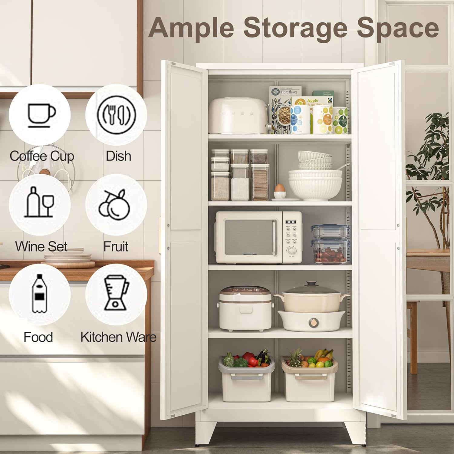 - Multi-Purpose: This tall pantry storage cabinet with doors and shelves an immense storage capacity. A true multi-purpose marvel, it adapts seamlessly to diverse needs. It can work as a craft storage organizer in your living room, or as bathroom storage, a wardrobe in your bedroom, a food pantry in your kitchen, or broom & cleansing tools storage for your laundry room
