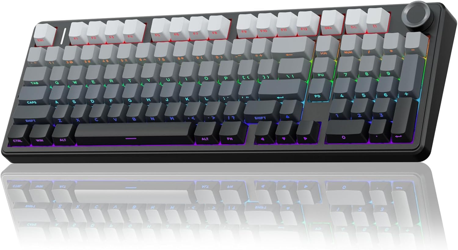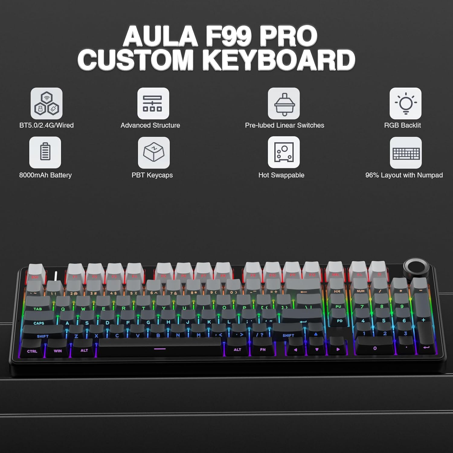 AULA F99 Pro Wireless Mechanical Keyboard with Knob,Tri-Mode BT5.0/USB-C/2.4GHz Hot Swappable Keyboard,Pre-lubed Switches,RGB Backlit PBT Keycaps Computer Gaming Keyboards (Side Printed Black)