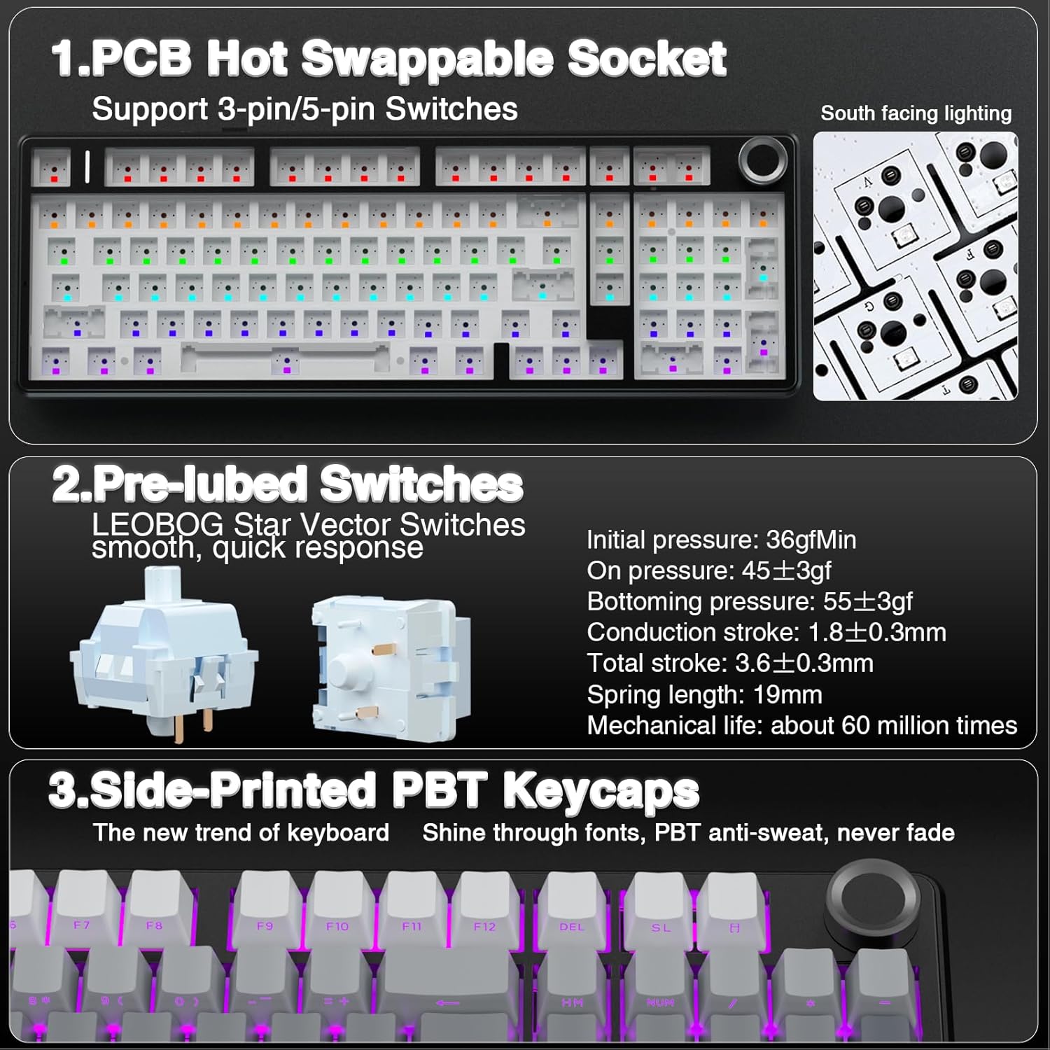 - Hot-swappable Custom Keyboard: The switches and keycaps can be freely replaced(keycap/switch puller are included in the package).This customizable keyboard with hot-swap PCB allows users to replace 3 pins/5 pins switches easily without soldering issue. F99 Pro mechanical keyboards equipped with pre-lubed linear switches, bring smooth typing feeling and pleasant typing sound, provide fast response for exciting game