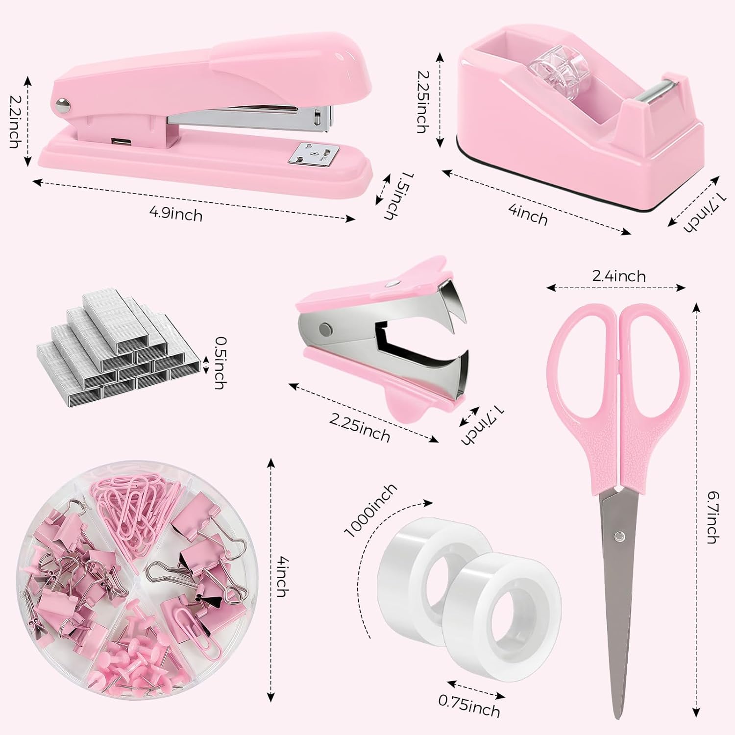 SKYDUE Pink Office Desk Accessories, Pink Office Supplies, Stapler, Tape Dispenser, Scissors, Clips and 1000pcs Staples,Office Supplies for Desk for Women