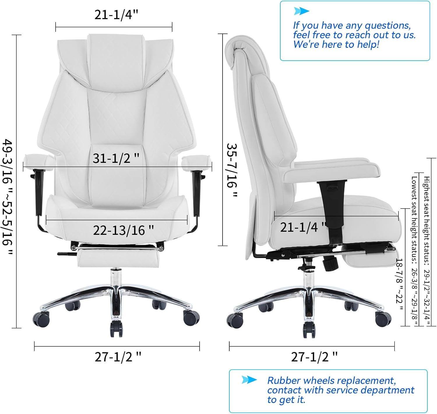 - Multifunctional Chair: Excebet ergonomic office chair offers adjustable height (18-7/8" to 22") for different individuals. Big and tall office chair hold 400lbs, tilt back to 135°, pull out the office chair retractable footrest, enjoy a good rest on the reclining office chair. Upgrade to adjustable armrests with soft pads, easy to hide under table top
