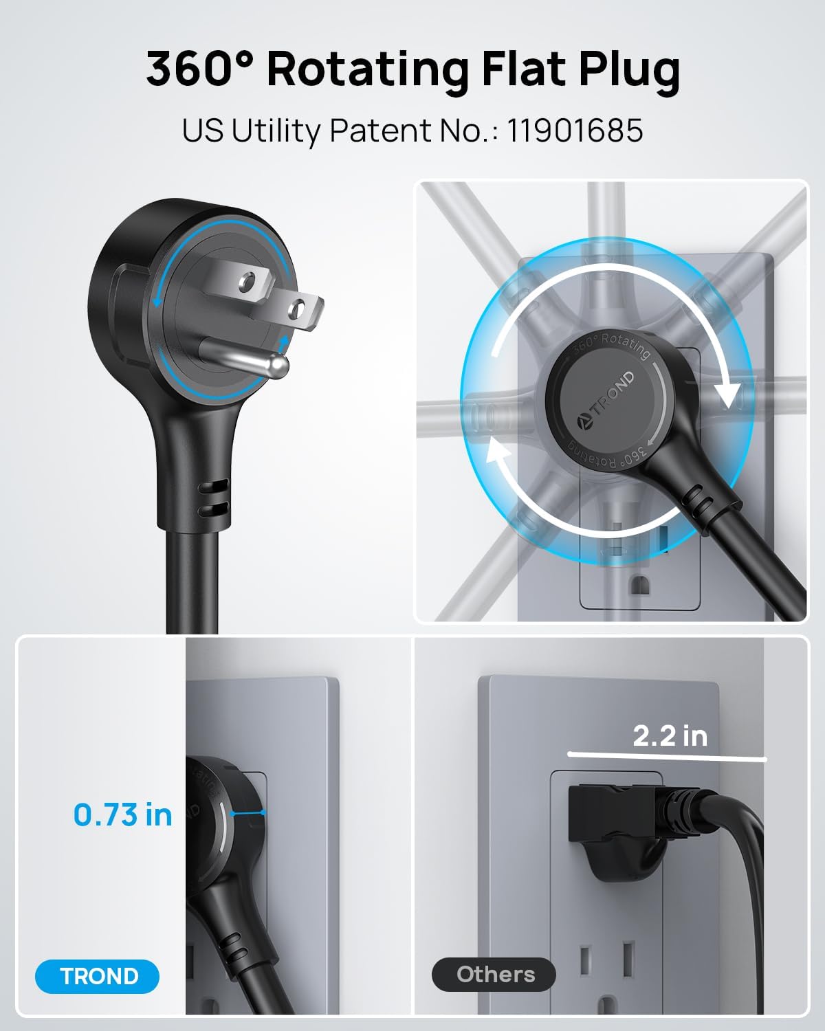 - 360° Rotating Flat Plug: This power strip features a swivel plug (0.73 inches in thickness), and the unique rotating design allows the plug to adjust to any angle, providing more flexibility and convenience in tight spaces. US Utility Patent No.: 11901685