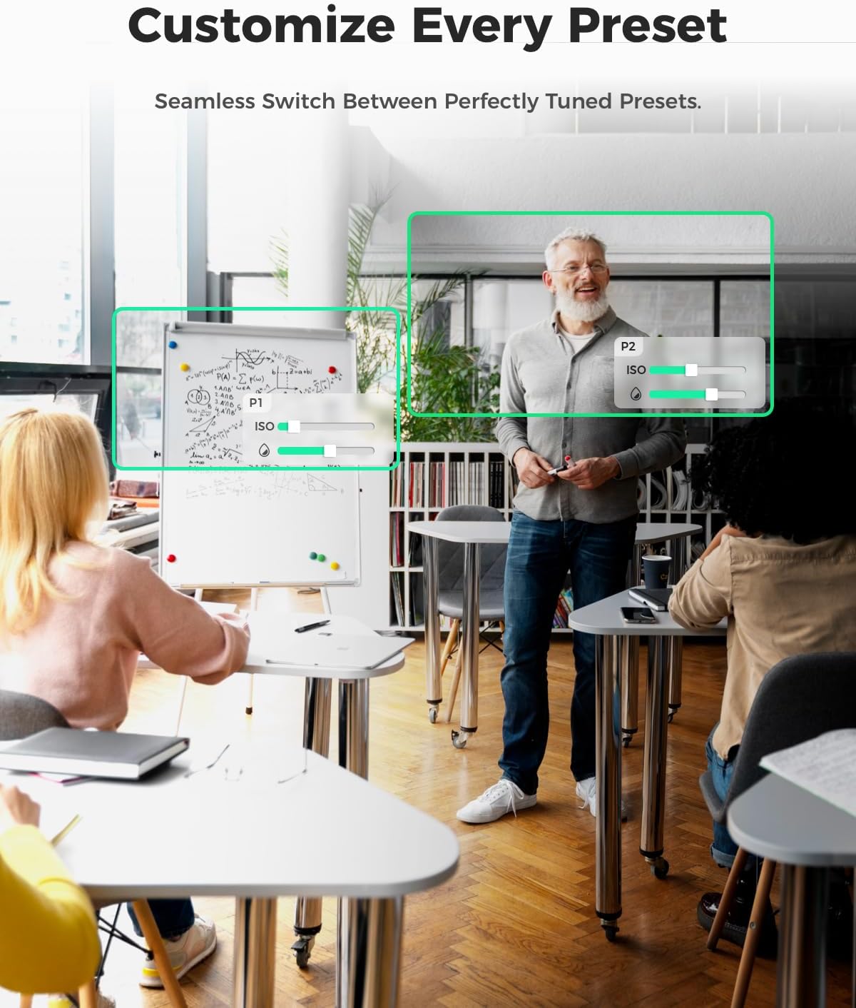 - ăCustomizable PresetsăOur computer camera newly upgraded preset position modes not only can set multiple preset positions, but also customizes separate parameters and AI tracking modes for each preset position. Effortlessly switch scenes and keep every frame perfect.