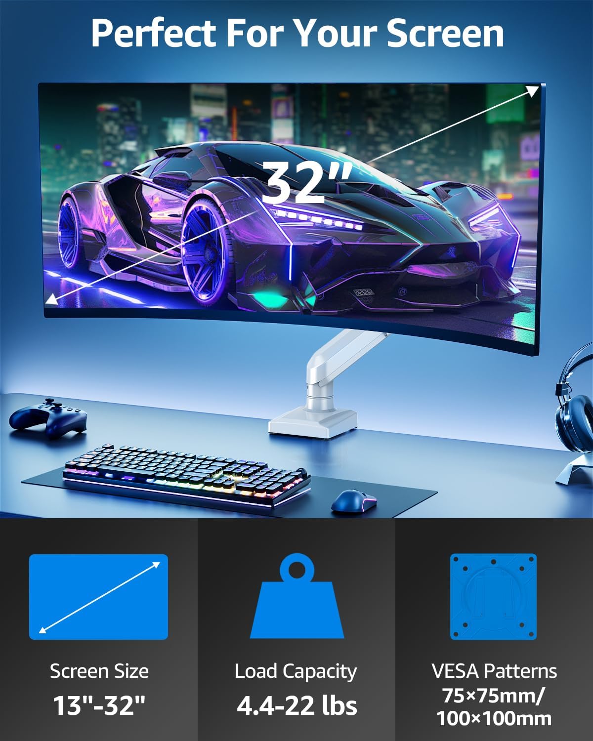 - Universal Single Monitor Arm: The Freelift Pro gas spring monitor arm is designed to most 22 - 32 inch flat or curved monitors, holding 4.4 - 22 lbs screens. With VESA patterns 75x75mm and 100x100mm, compatible with Samsung, ASUS, Acer, LG, HP, AOC, Dell, Sceptre, etc. It is perfect for anyone seeking a sturdy and reliable full motion monitor mount for workspace.