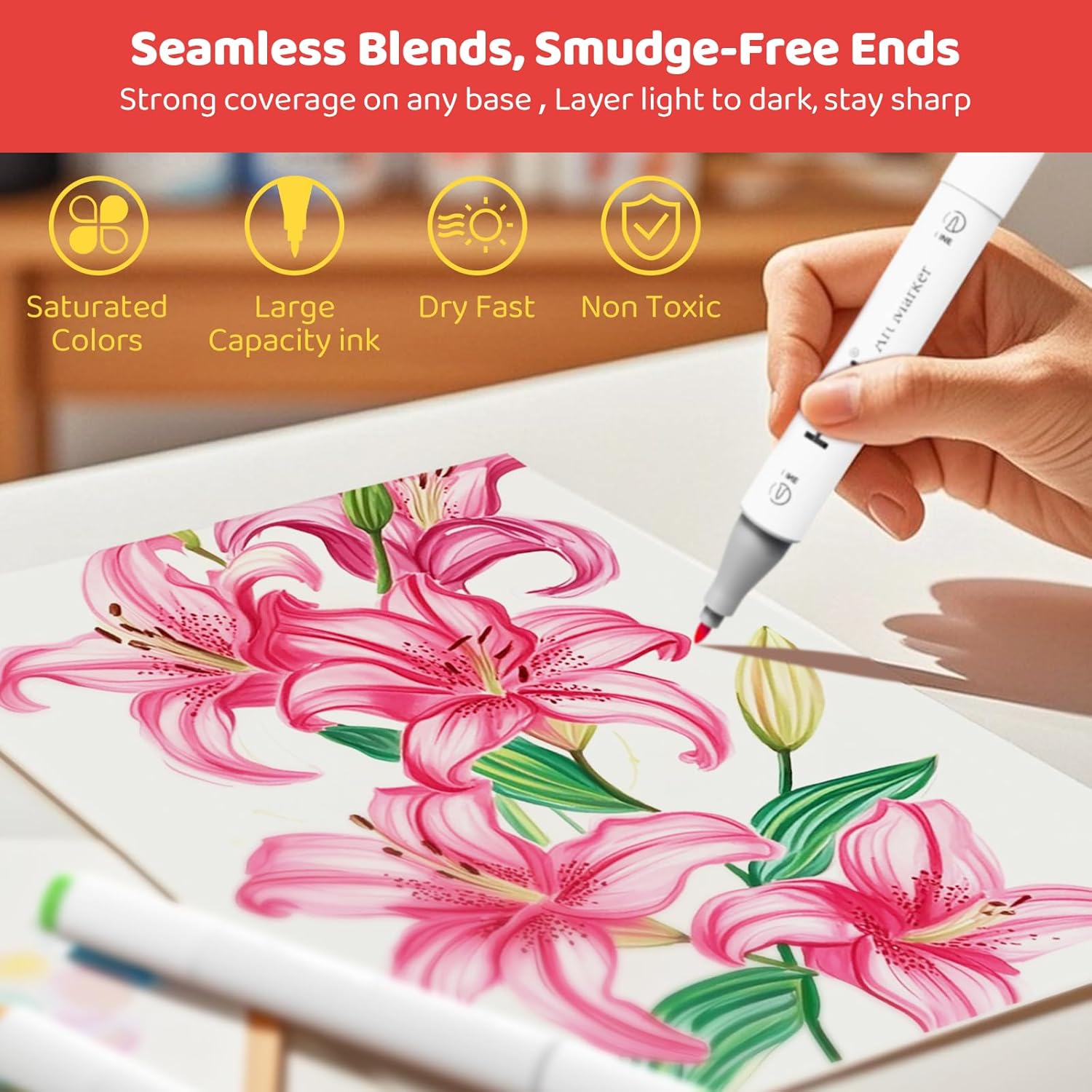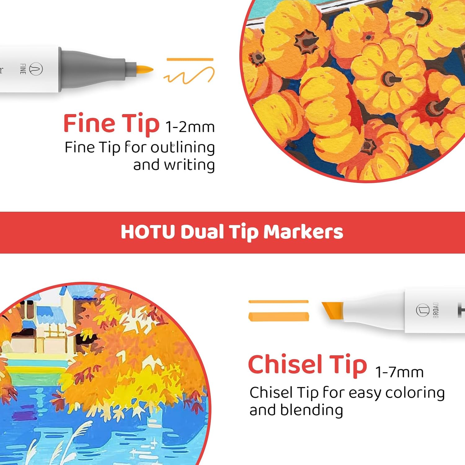 - 【SEAMLESS BLENDING】Tired of smudged patches and uneven coloring? HOTU's premium ink masters seamless blending, whether soft shades or bold colors, every mix flows perfectly smooth. What's more, each alcohol markers set includes a plastic pad to prevent ink bleed-through. Let's creat crisp, zero-smudge artwork with the alcohol markers!