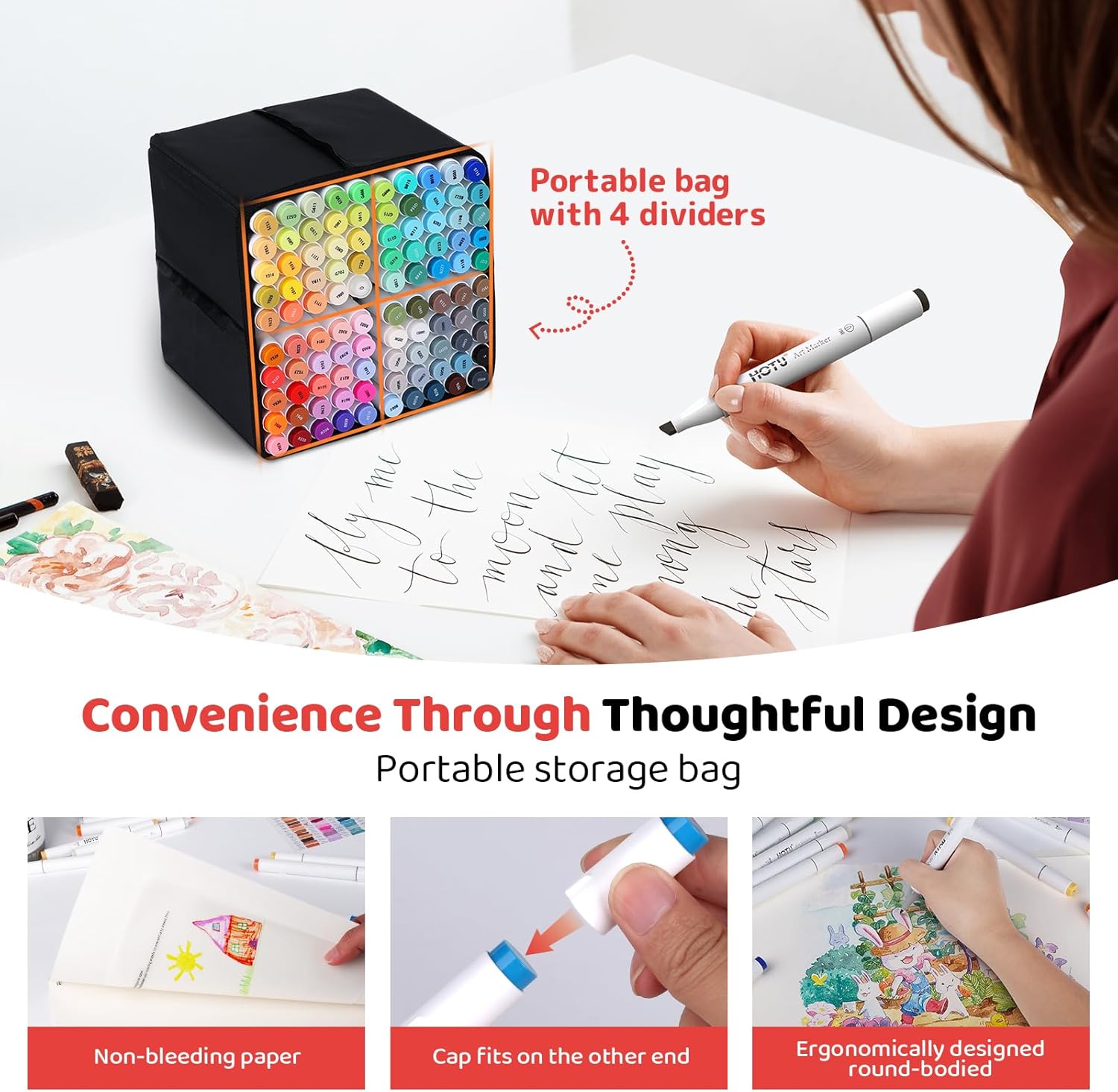 - 【COLOR CODED CAPS, ORGANIZED STORAGE】HOTU alcohol markers feature visible color-coded caps, allowing you grab your color soulmate from 100 colors rapidly. Besides, the quad-section storage pouch organizes markers by color family— for orderly and efficient creativity on the go. A great gift for artists.