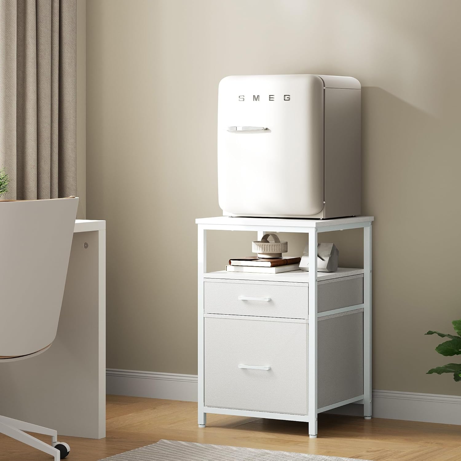 - Three-Tier Storage Design - This mini fridge stand features two fabric drawers (NOT WOOD) and one compartment, offering a total of three storage spaces to perfectly meet your various storage needs. Itβs not just a mini fridge stand with storage; itβs also a great mini fridge organizer, helping you easily keep items around your fridge tidy and organized.