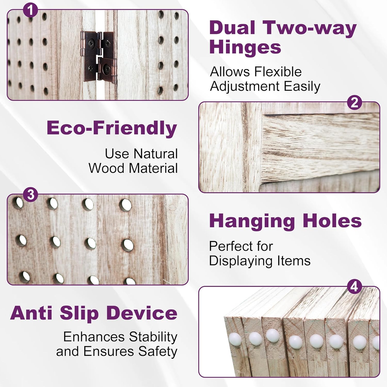 Room Divider, 5.6FT Folding Room Divider Panel, 6 Panel Pegboard Display Wood Partition Wall Divider for Room Separation& Craft Shows, Natural Wood