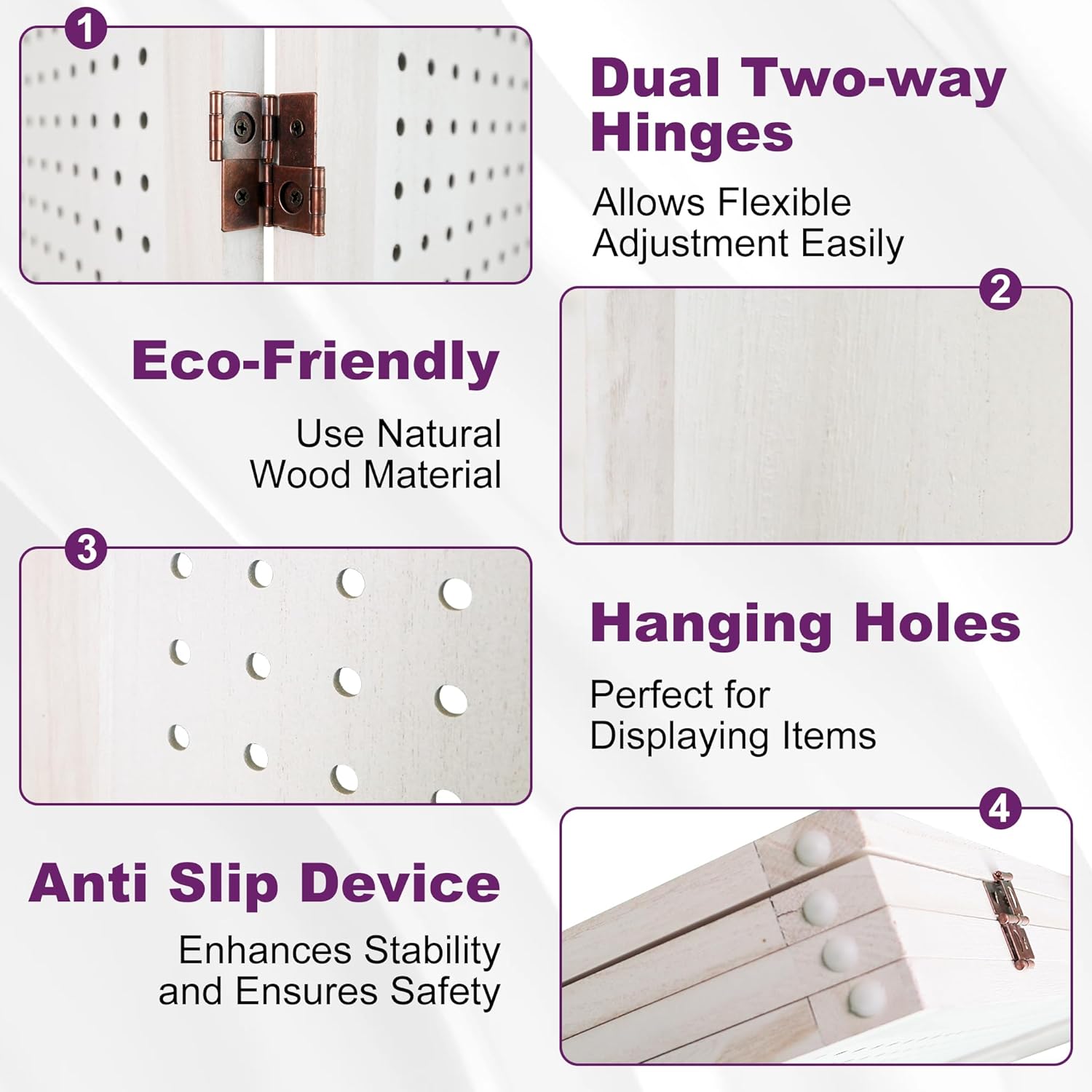 Room Divider, 5.6FT Folding Room Divider Panel, 4 Panel Pegboard Display Wood Partition Wall Divider for Room Separation& Craft Shows, White
