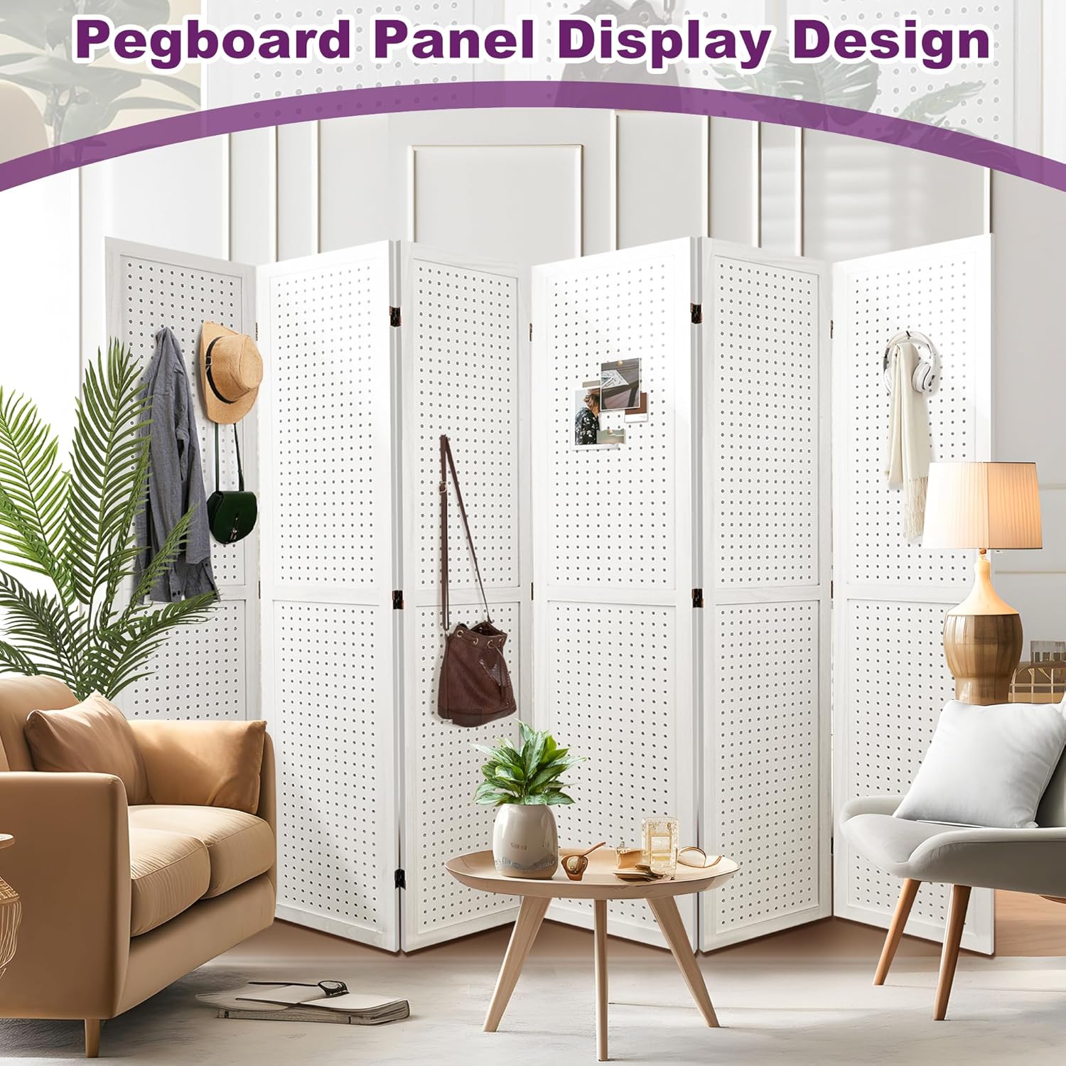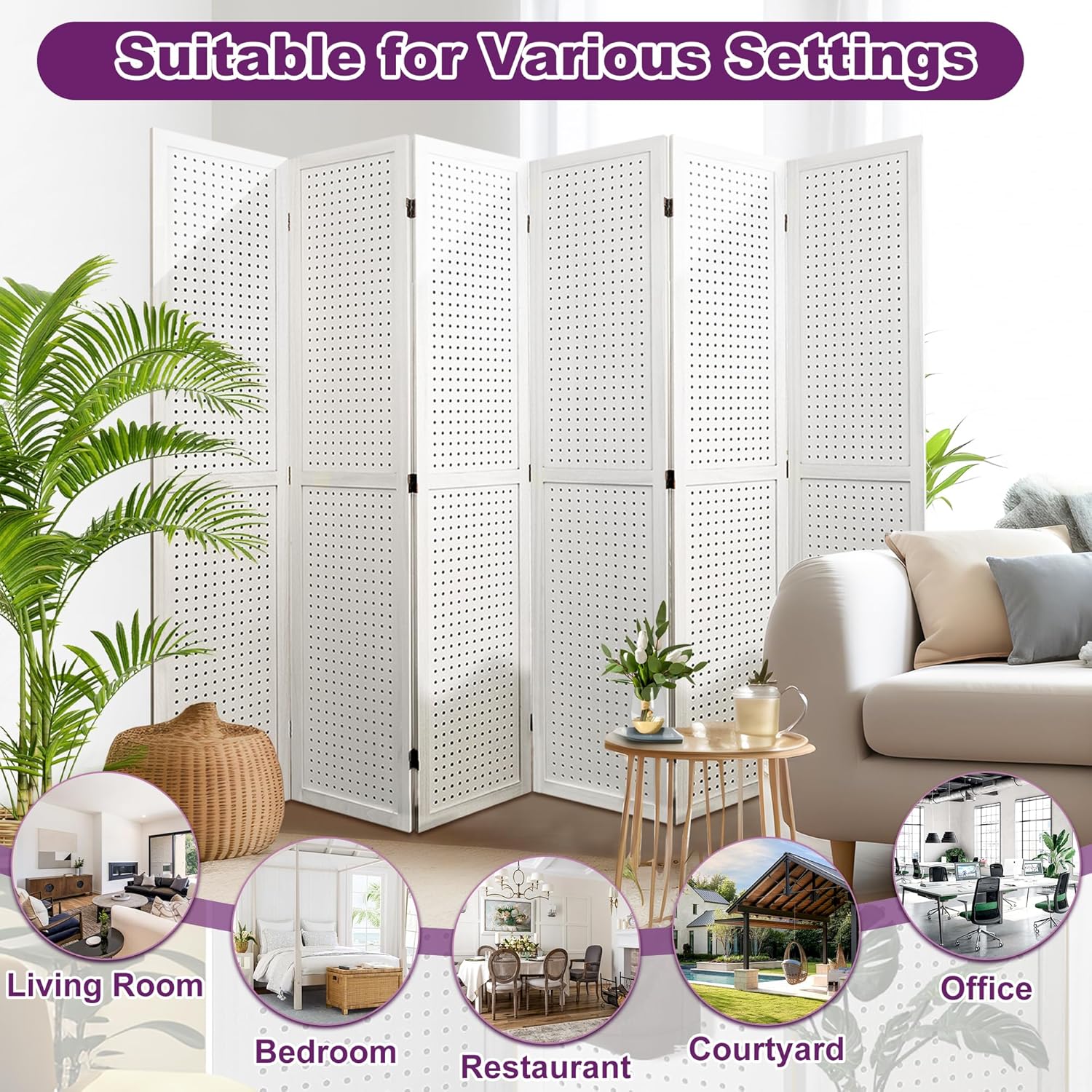 Room Divider, 5.6FT Folding Room Divider Panel, 6 Panel Pegboard Display Wood Partition Wall Divider for Room Separation& Craft Shows, White