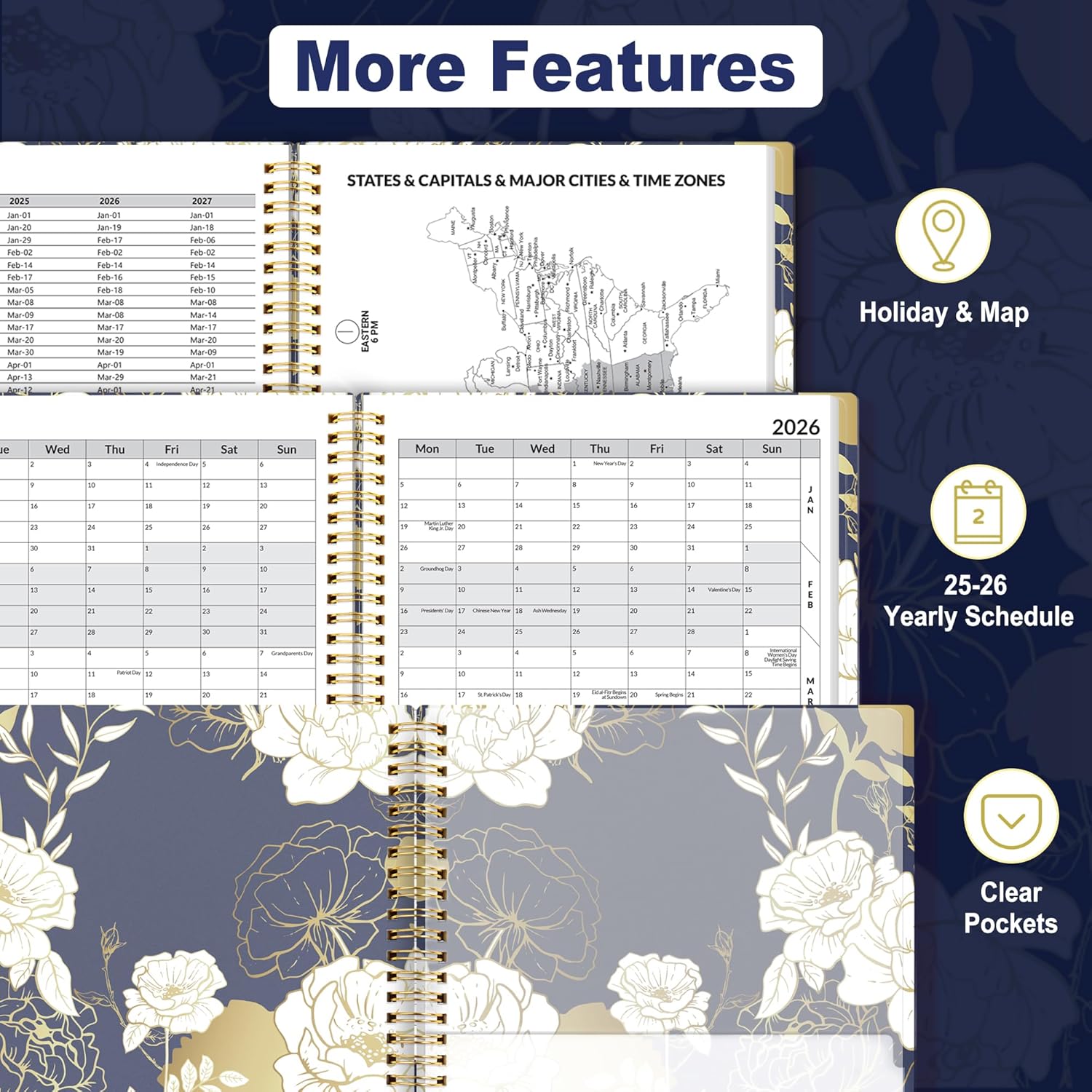 - Additional Features: The weekly planner includes 2025-2027 calendars, year schedule for academic year 2025, holiday lists, contact pages, notes pages, important dates, and US time zone map. Rainbow monthly tabs simplify navigation and add a stylish, playful element to the planner's aesthetic.
