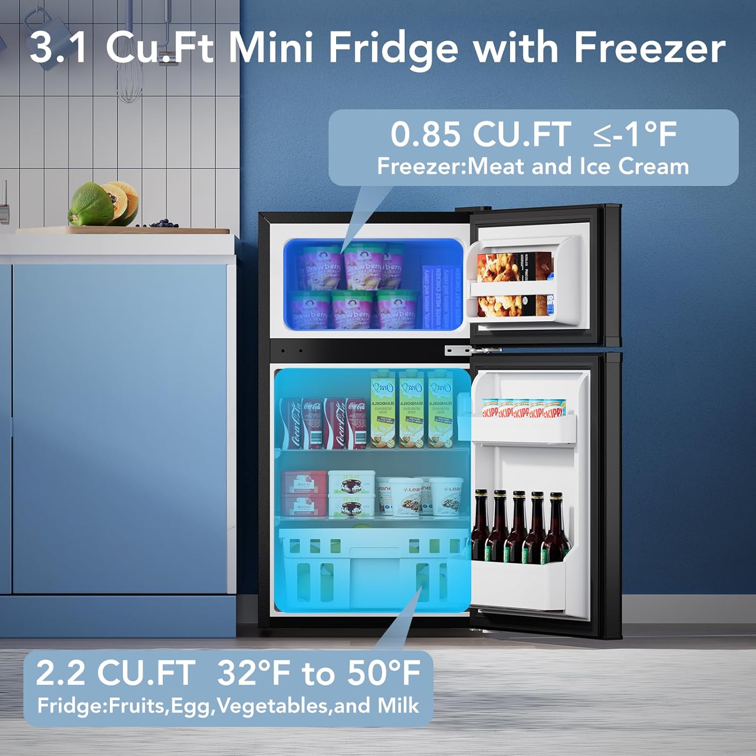 - This 3.1 cu.ft mini fridge features a built-in freezer compartment. offering dedicated space to keep fresh foods organized and ample room for storing frozen items. With its space-saving design, it fits seamlessly into tight spaces like dorm rooms, bedrooms, offices, or RVs.