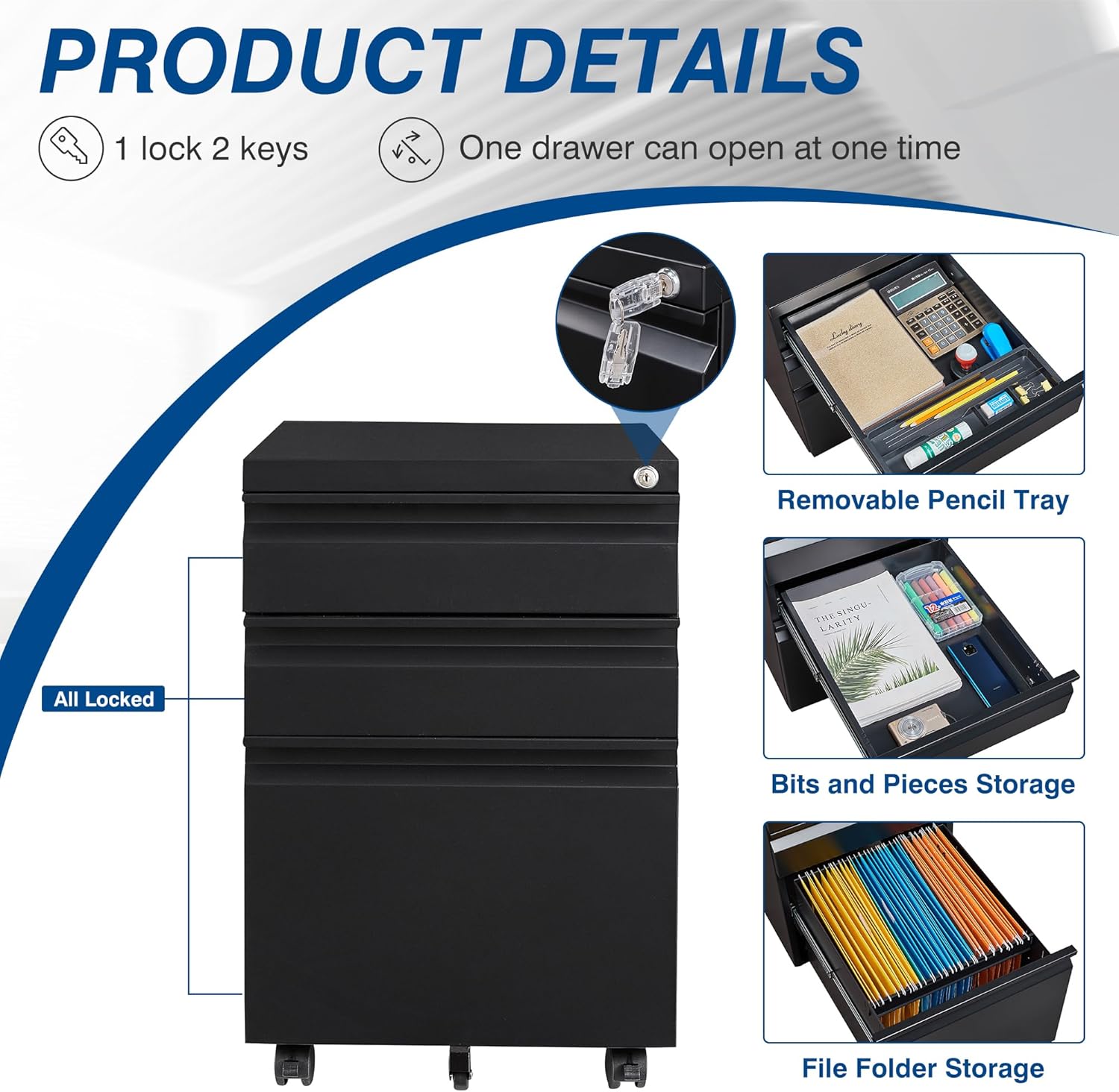 3 Drawer Mobile Metal File Cabinet, Black Filling Cabinets with Lock, Pre-Built Office Storage File Cabinet with Wheels Under Desk - Assembled Required