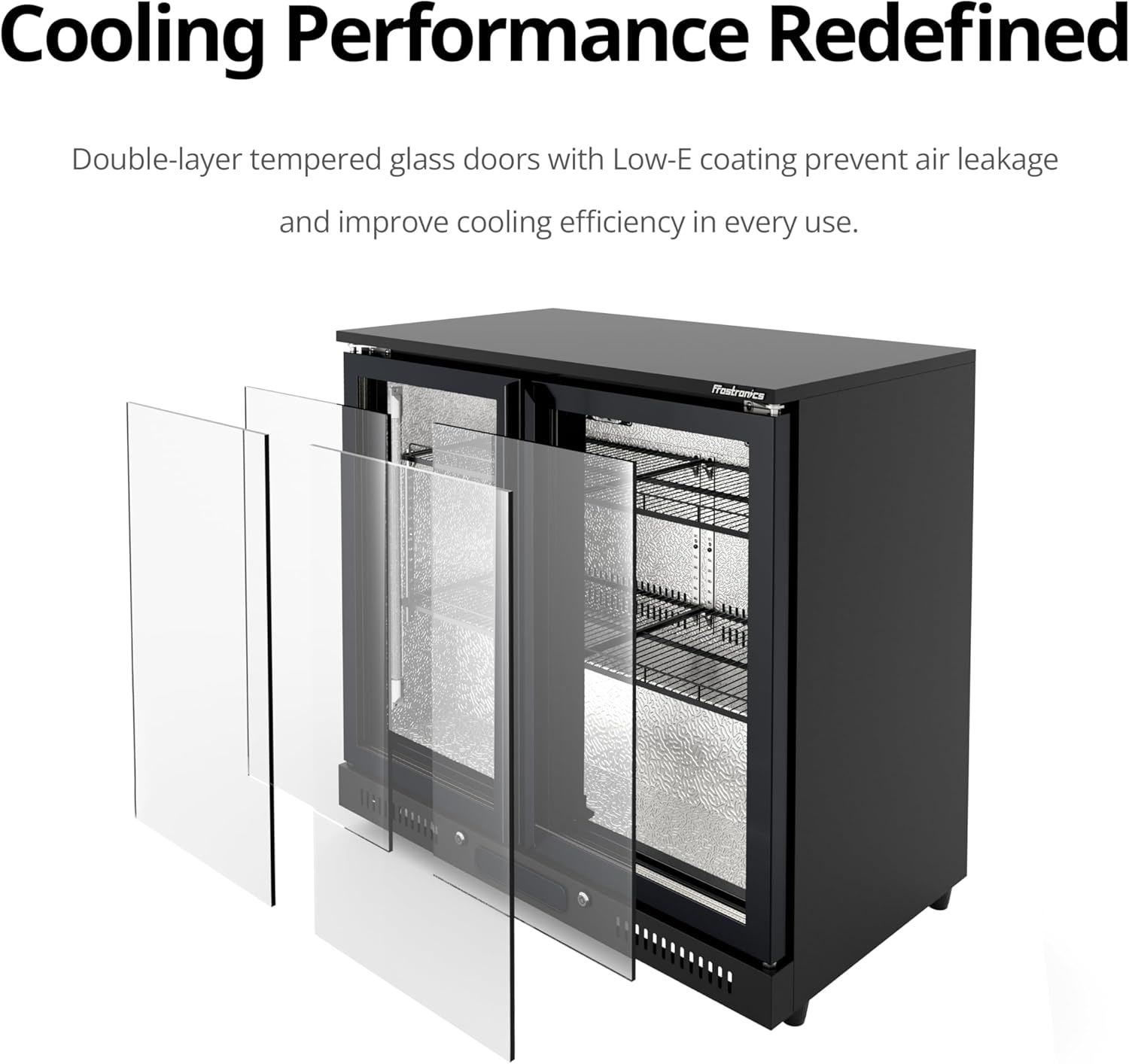 - 〔Hinged Door Design〕Your Frostronics double hinged door back bar cooler offers a compelling alternative to our space-saving sliding door model, delivering enhanced cooling performance through a more secure, reliable airtight sealing and double-layered glass doors with low-E coating. These features ensure optimal temperature retention and energy efficiency, making it an ideal choice for businesses prioritizing performance and reliability.