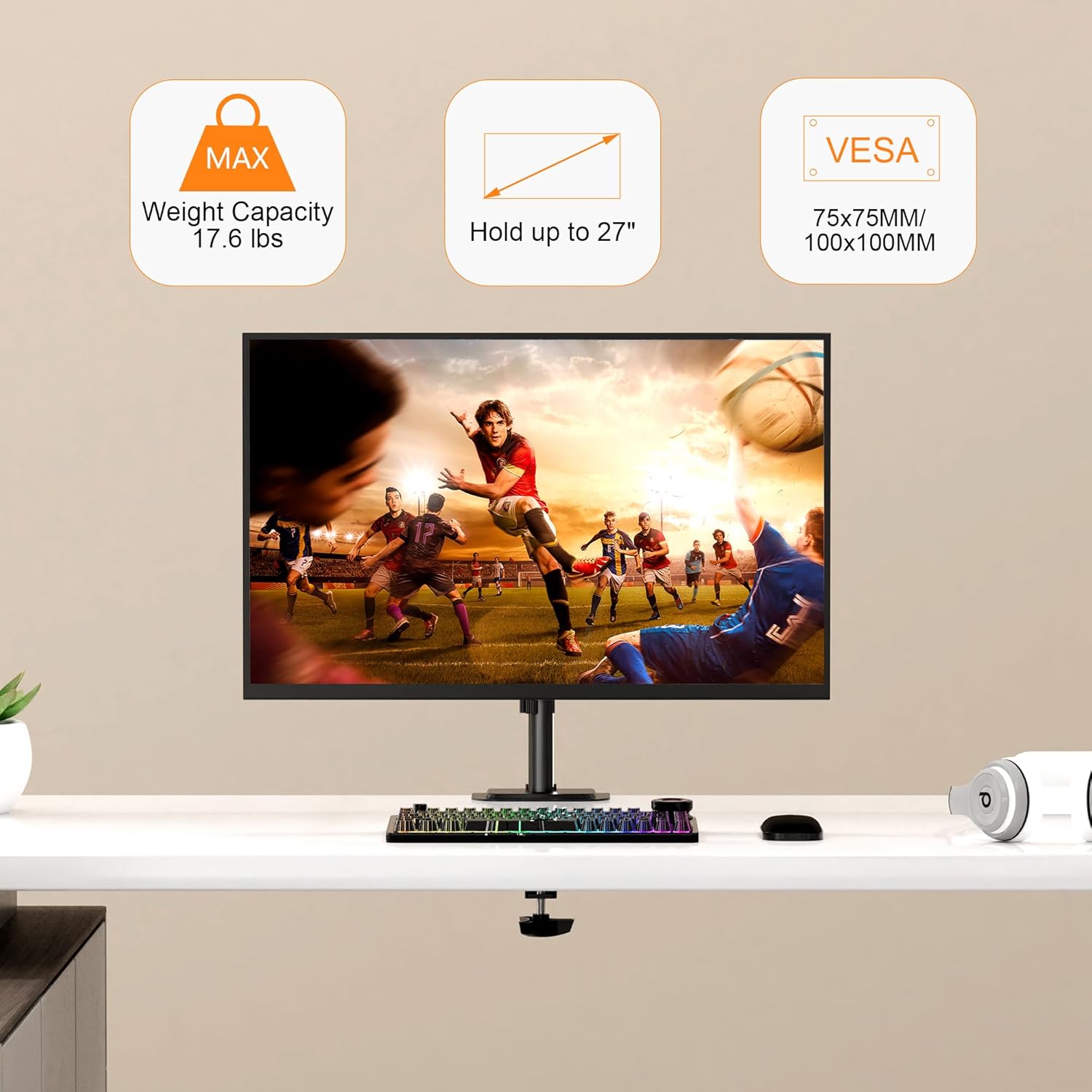 - Single Monitor Mount: This single monitor arm fit most for 13-27 inch screens, monitor arm weight up to 22lbs, fit VESA 75x75mm or 100x100mm backside mounting holes. Cable management clips can make your cable become tidy.