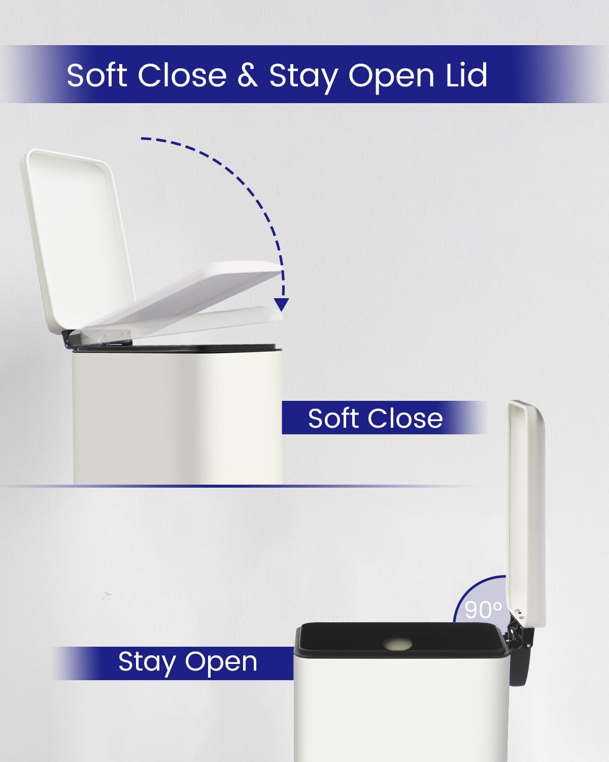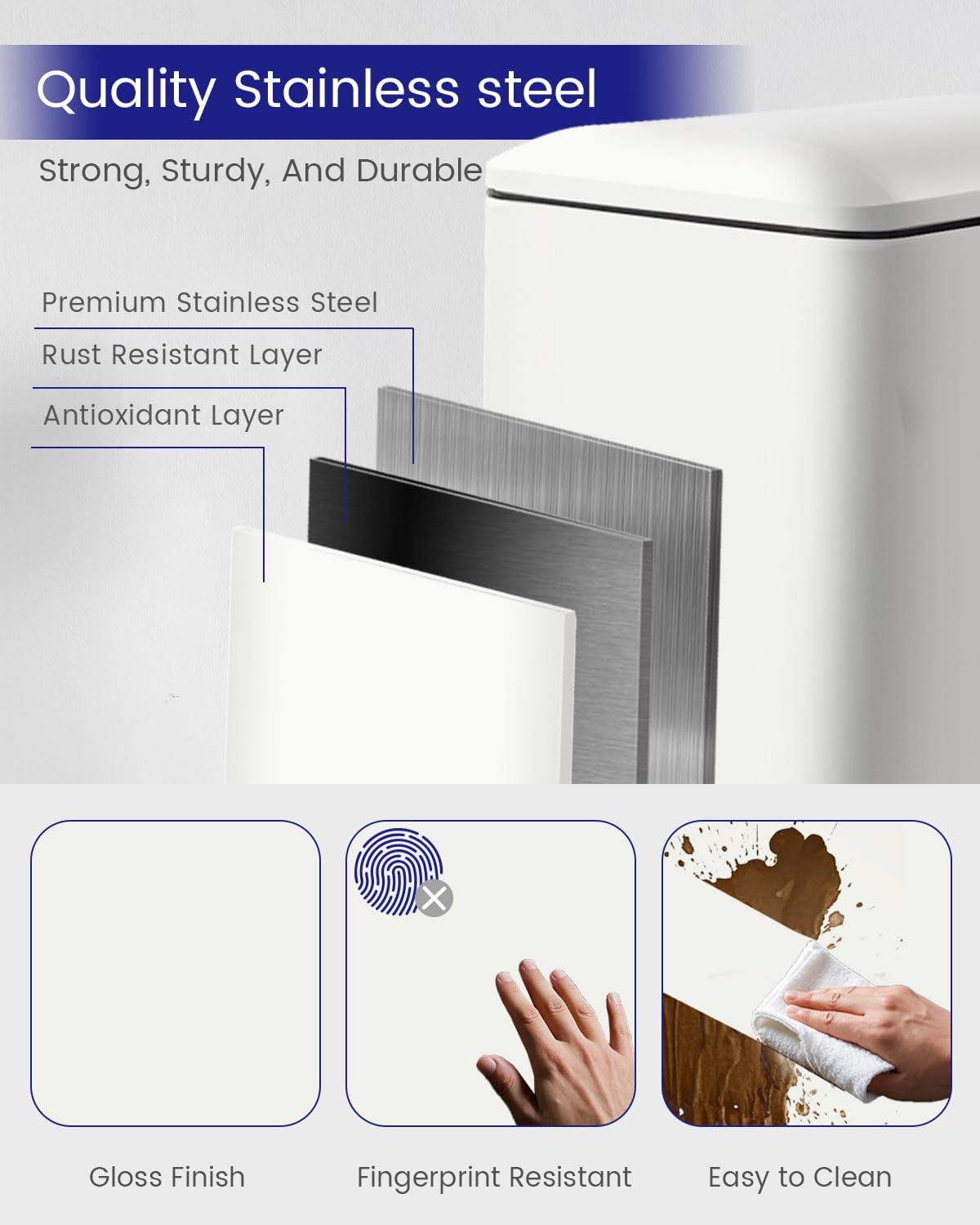 - High quality steel: our slim bin with lid is made of stainless steel, thick and durable, as well as anti-fingerprint and rust and makes cleaning easy! A white finish with a sleek, modern look that easily matches any decor.