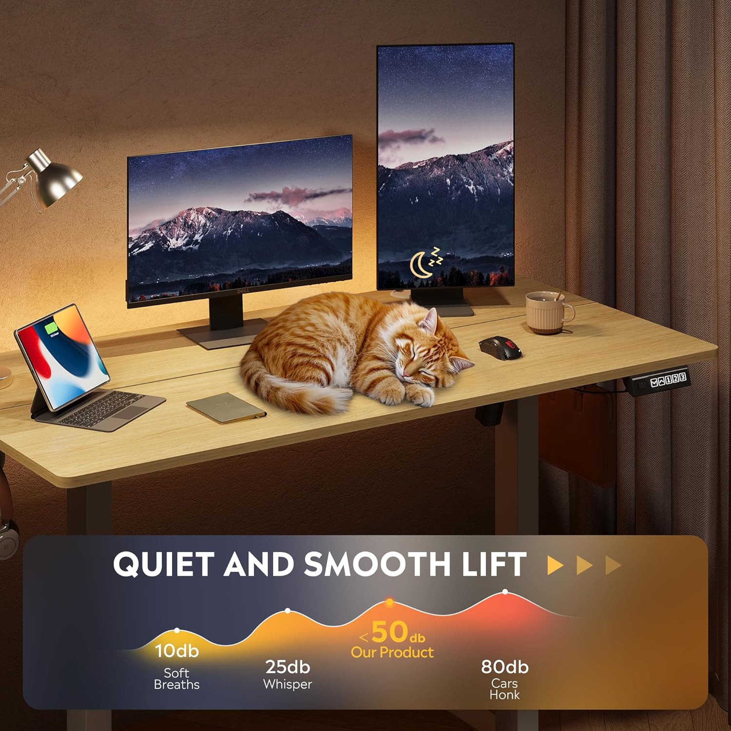 - ăQuite & Smooth Height AdjustmentsăTri-motor system delivers whisper-quiet (<50dB) height transitions (28.35"-46.45") in seconds, eliminating manual adjustments and prevent desktop tilting. Standing desk adjustable height perfected for ergonomic shifts, ensuring buttery-smooth operation whether sitting or standing.