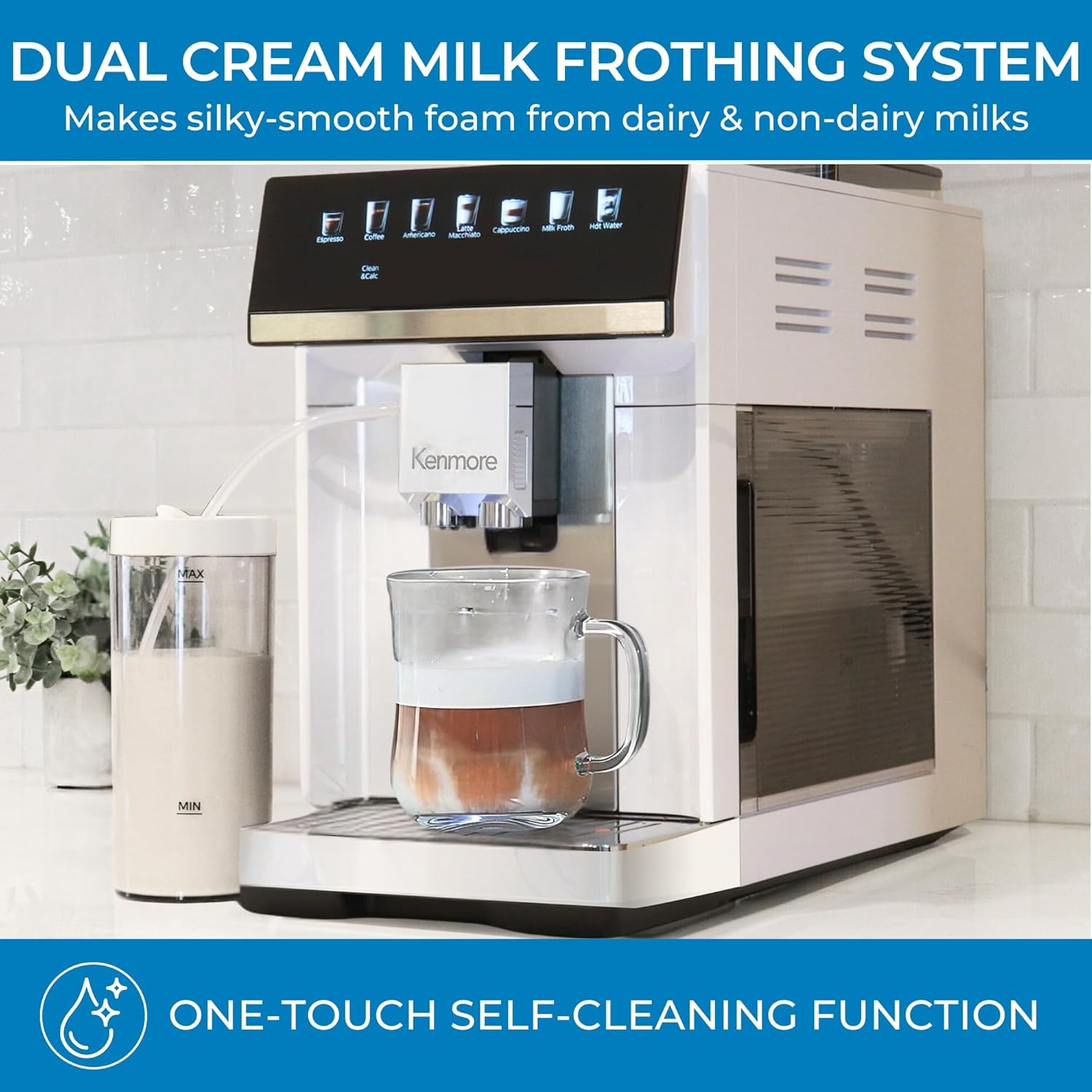 Koolatron Kenmore Espresso Machine – All-In-One Fully Automatic Coffee Maker With Auto Tamper, Descaler, Milk Steamer & Frother, Bean Grinder, Professional Barista Style Cappuccino, Cafe Latte, White