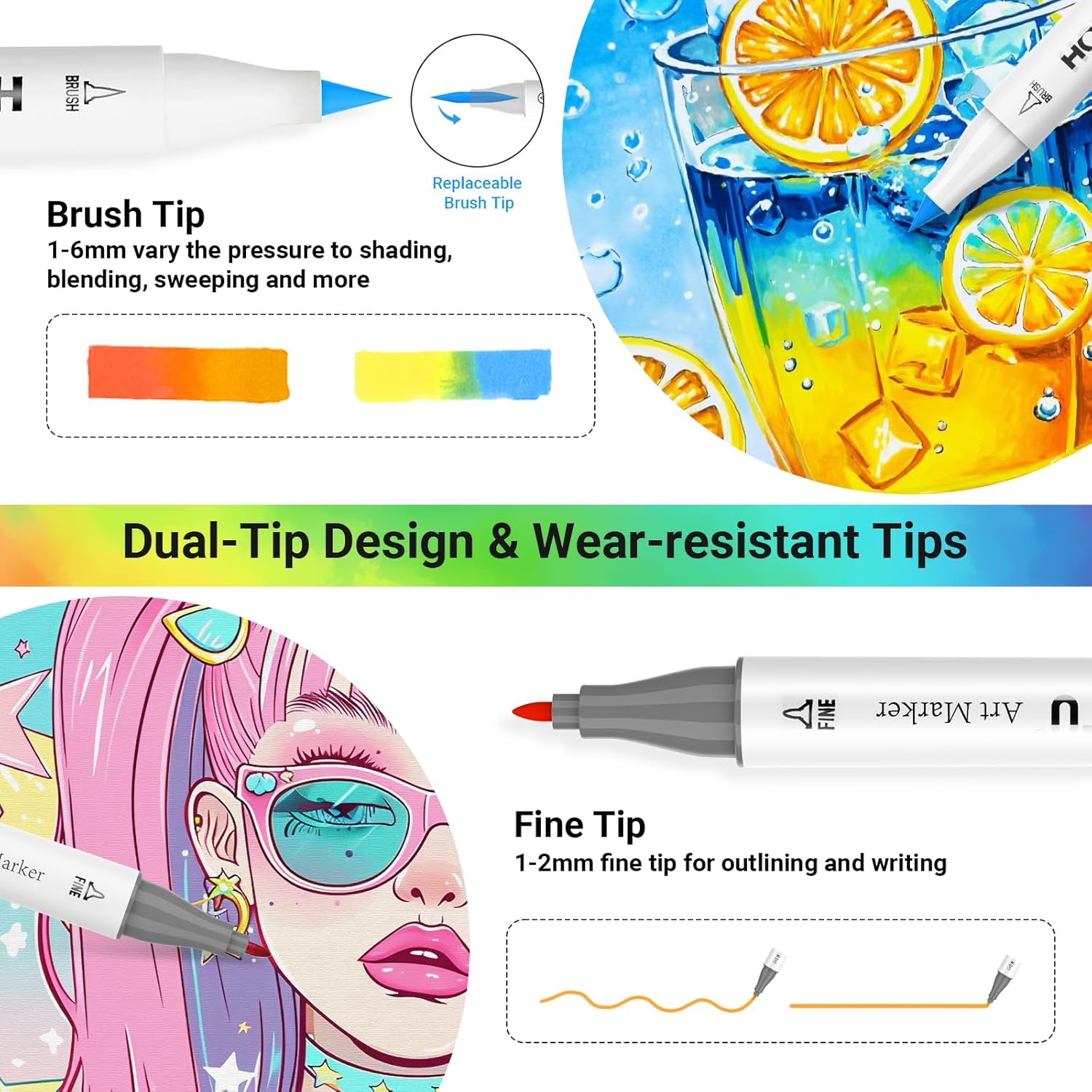 - BRUSH & FINE, DOUBLE - TIP, DOUBLE THE FUN: HOTU alcohol markers are more durable and their tips do not fray easily. Unleash your creativity with the alcohol markers brush tip and fine tip! Choose the alcohol markers brush tip for sweeping, calligraphic strokes or fine tip for drawing precise lines and details. What's more, the brush tip will provide you with a painting experience as soft and smooth as caressing feathers, and it can easily transition from fine lines to broad strokes.This makes your artworks more dynamic and engaging.