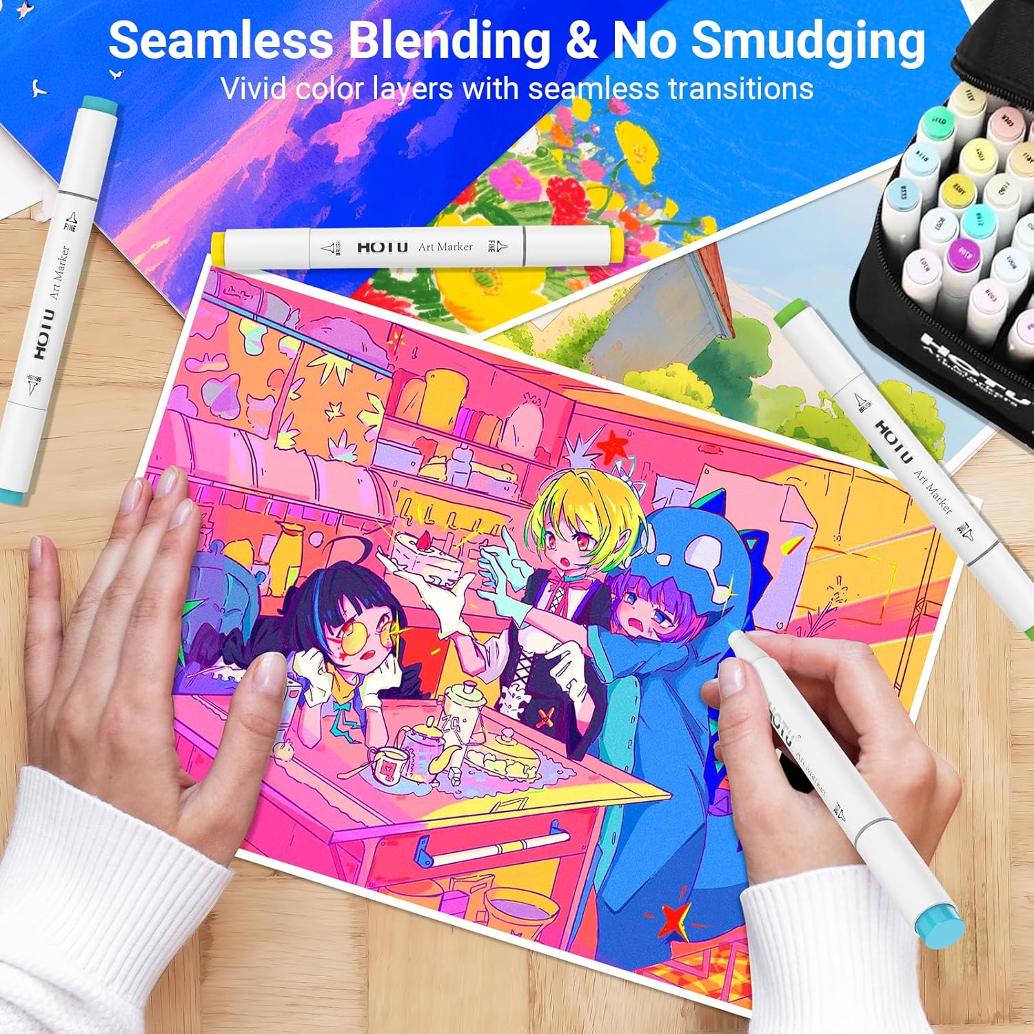 - ANTI-BLEEDING PAD : Our HOTU alcohol markers come with a matching anti-bleeding pad. You no longer need to worry about dirtying the table or other paper when creating, thus keeping the creative environment clean and perfect at all times. (NOTE: As alcohol based markers like all other brand alcohol markers, they will Bleed through regular coloring paper, except very thick paper, marker paper)