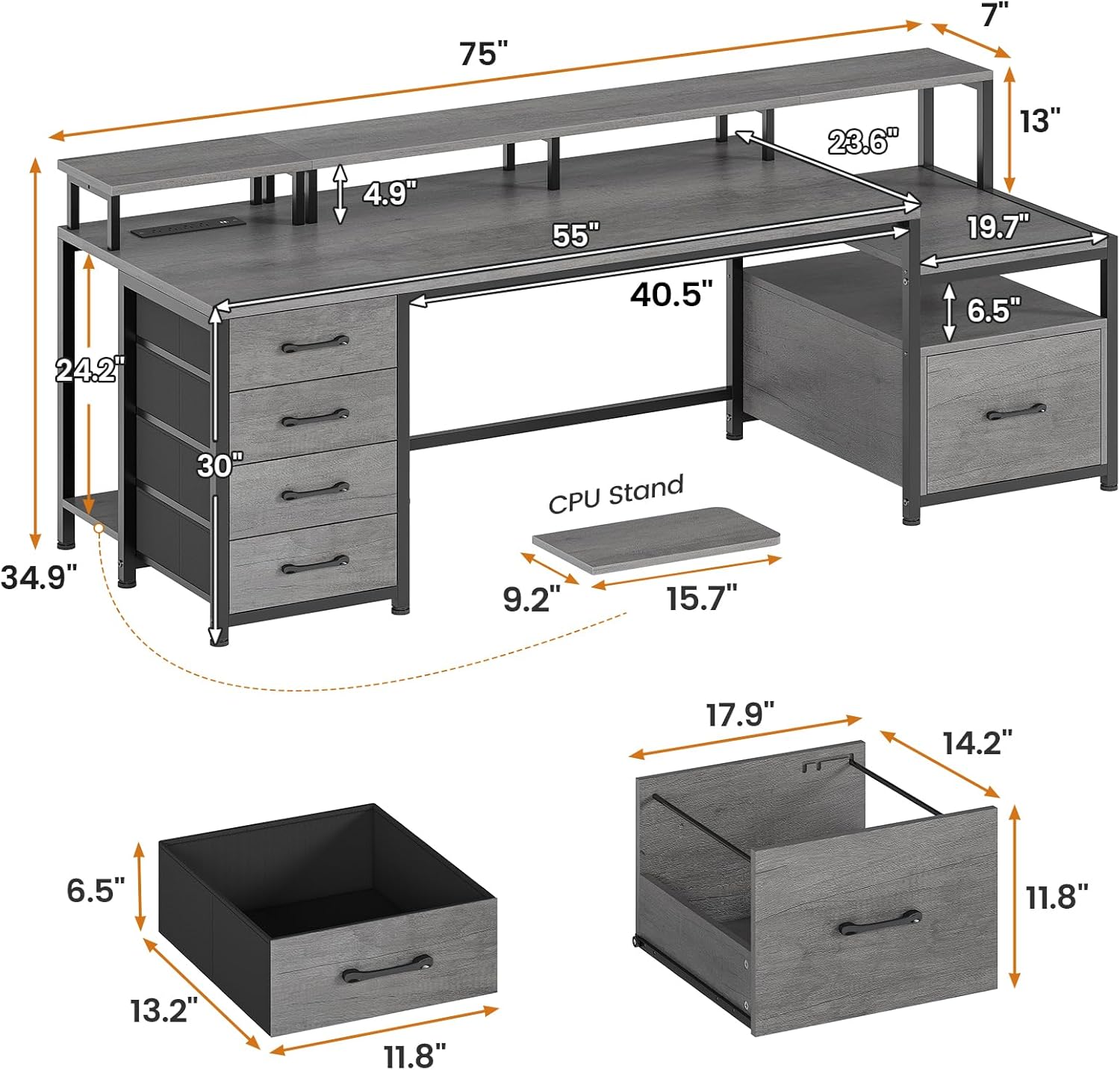 - Special Feature : file drawer, 4 fabric storage drawers, power outlet, printer cabinet, CPU stand and led light