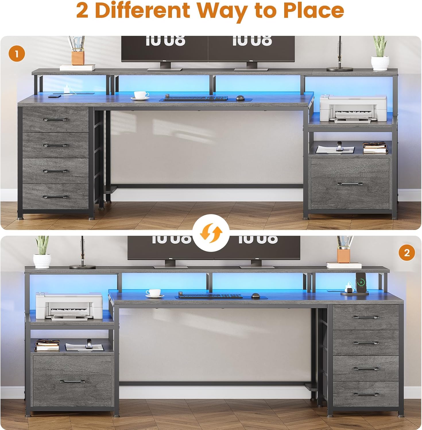 - ăMultifunctional Computer DeskăCreate a versatile workstation thatâll meet all your needs with this all-in-one office desk with large computer desktop, monitor riser, file drawer, 5 storage drawers, power outlet, printer cabinet, CPU stand and led light; An ideal desk for small rooms or limited spaces to create excellent home office space.