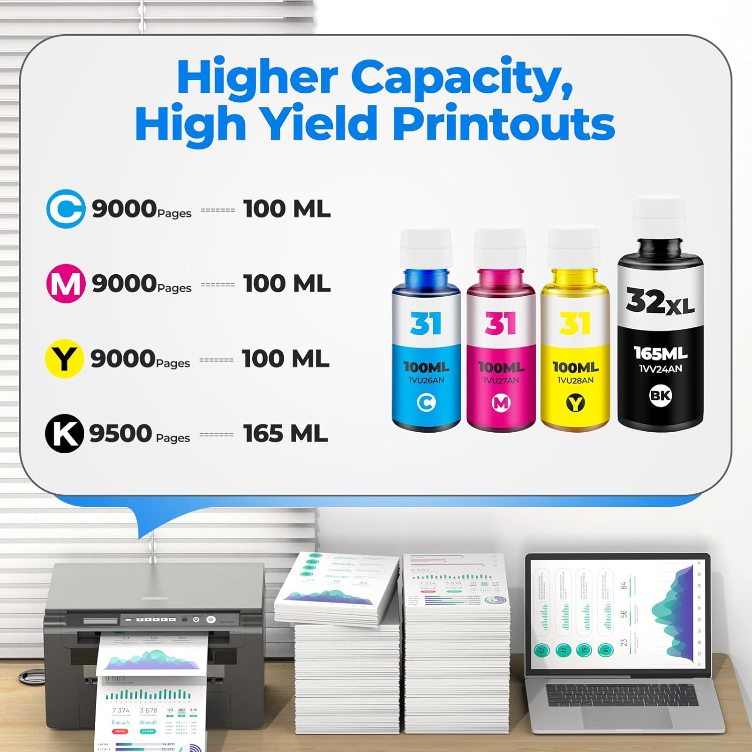 - About the Page Yield: These smart tank inks are high capacity 31 32xl inks and can print more printouts. At 5% coverage on A4 paper, 9500 pages for 32xl black ink bottle, 9000 pages for cyan 31 ink bottle, 9000 pages for yellow ink 31 bottle, and 9000 pages for magenta 31 ink bottle. The replacements for smart tank 5101 ink bottles, smart tank 7602 ink bottles, smart tank 5000 ink bottles, smart tank 651 ink bottles, smart tank 7001 ink bottles, smart tank 7301 ink bottles, smart tank 5103 ink