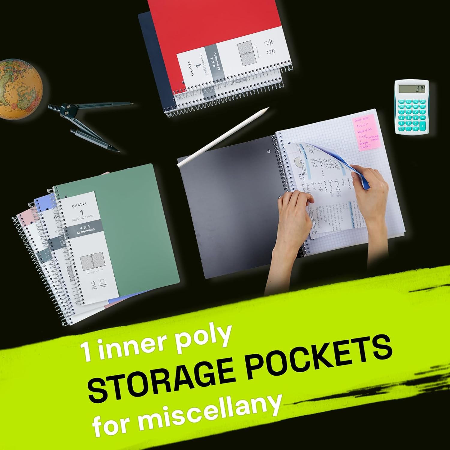 Spiral Notebook for School 6 Pack, 1 Subject, 4x4 Graph Ruled Paper, 100 Sheets, 9" x 11", 1 Divider with Pocket, 3 Hole Punched, Plastic Cover, 1/4" Grid Note Book Bulk, Assorted Colors