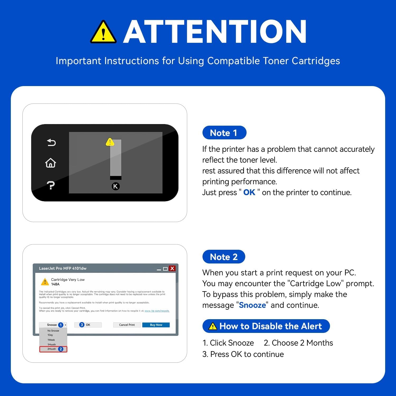 - 📢Important Note: Please must close the HP Genuine Mode before you install compatible toner cartridge with chip, the step is Setup >Supply Settings >Cartridge Supply>off. In order to avoid firmware update to block the compatible toner cartridge to be used continuously in the future, please also close the Printer Update and Firmware Update in Setup.