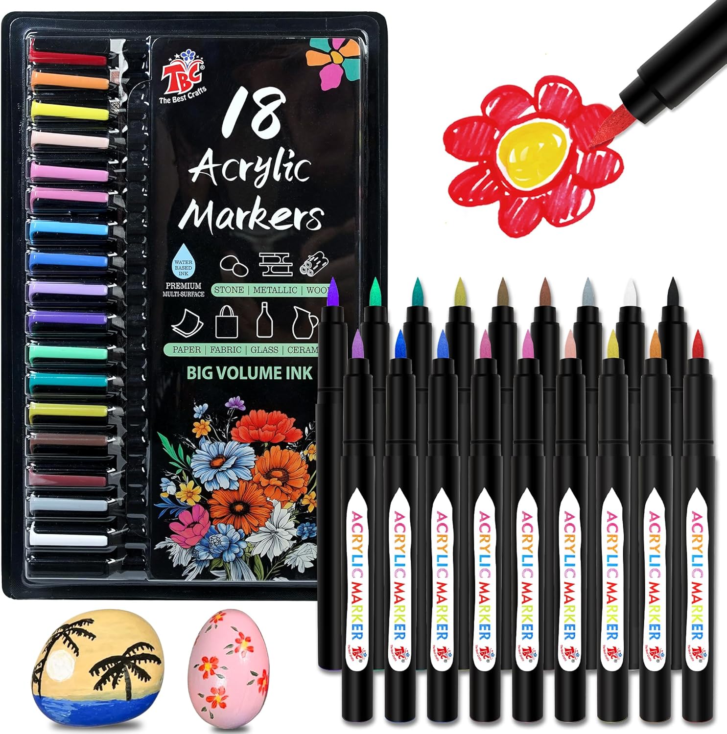 TBC The Best Crafts Acrylic Paint Markers, Big Volume Ink,Waterproof, Non-Toxic, odorless, Suitable for Paper, Pottery, Stones, Backpacks, Glass, Pack of 18