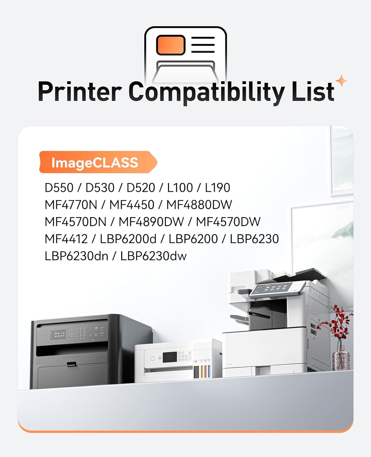 - Compatible Printers: Compatible with Canon imageCLASS D550 D530 D520 Faxphone L100 L190, ImageCLASS MF4770N MF4450 MF4880DW MF4570DN MF4890DW MF4570DW MF4412 LBP6200d LBP6200 LBP6230 LBP6230dn LBP6230dw Series Printer.