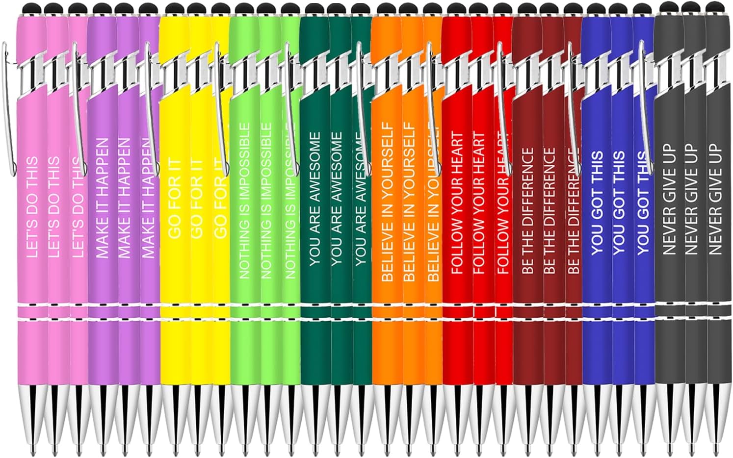 • Inspirational Quotes: Each cool pen is adorned with a different inspirational saying, like "GO FOR IT," "NEVER GIVE UP," "YOU GOT THIS," and "NOTHING IS IMPOSSIBLE." These high-quality pens with stylus tips in various colors will continue to motivate you for years to come.