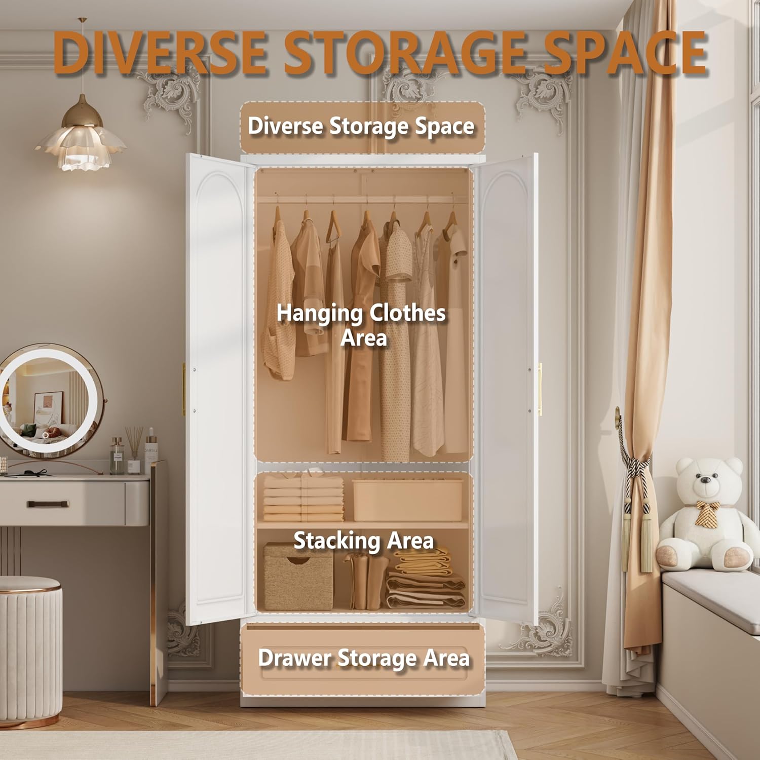 - [STURDY AND RELIABLE] Crafted from thickened steel panel, this white wardrobe with drawer stands firm and stable. Its robust clothing hanging pole can withstand up to 66LBS loding-bearing, ensuring years of reliable use. Reinforced joints and thick metal panels guarantee no wobbling or collapsing, even when fully loaded with lots of clothes