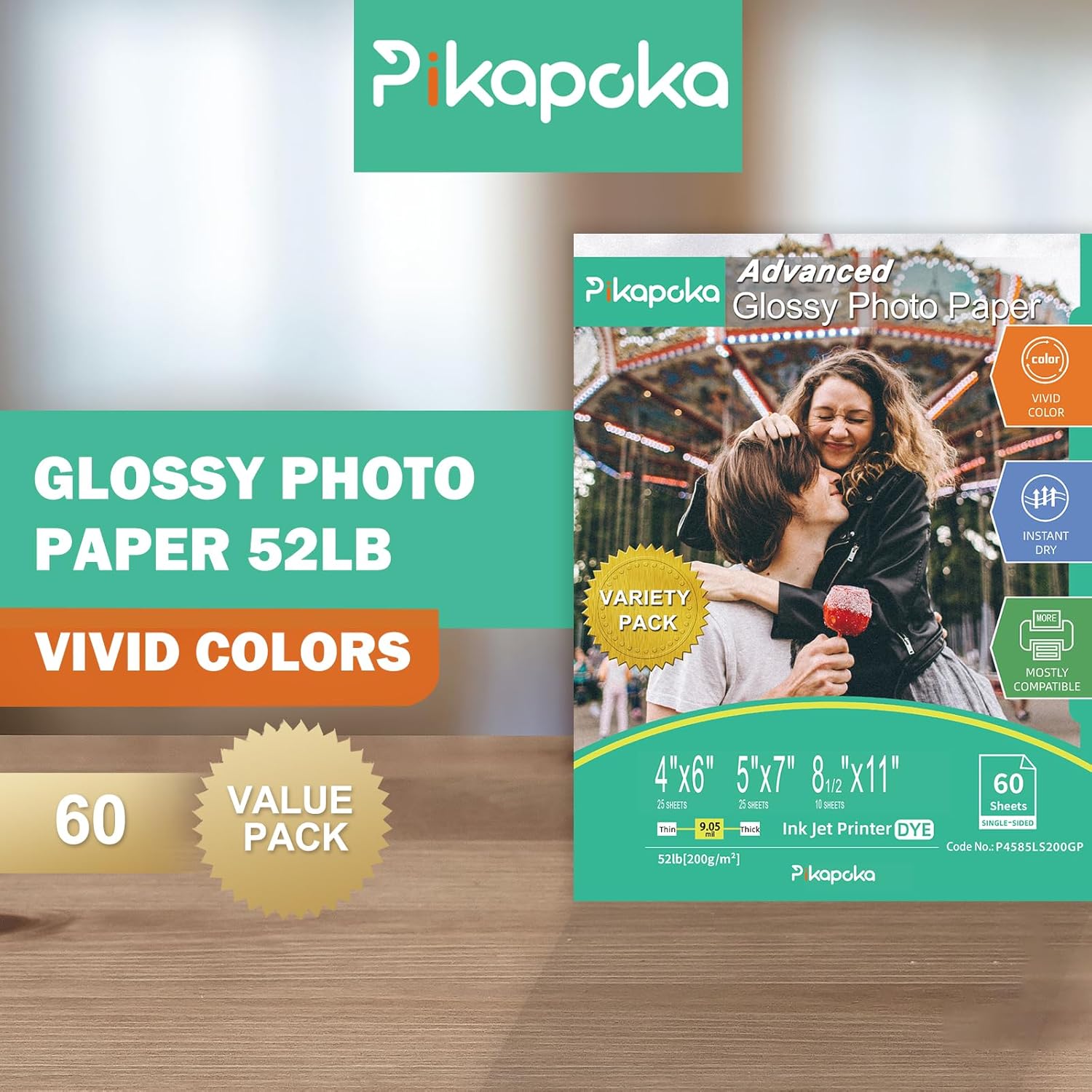 Glossy Photo Paper 4x6, 5x7, 8.5x11, 60 Variety Pack Bulk, Assorted Sizes, Inkjet printer, 52lb/200gsm