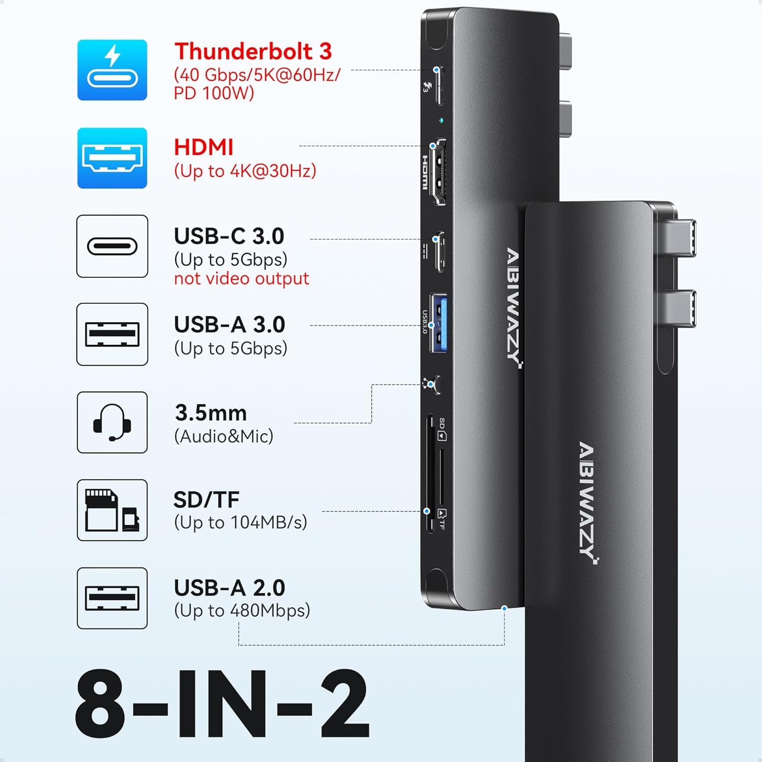 - Enhanced Connectivity with 4K HDMI and 5K Thunderbolt 3 MacBook Hub: Elevate your MacBook experience with our versatile USB C Hub. Enjoy stunning 4K resolution at 30Hz through the HDMI port and immersive 5K visuals at 60Hz via the Thunderbolt 3 port. Achieve Dual Monitor Display effortlessly—mirror or extend your laptop screen to TVs, monitors, or projectors. Note: MacBook models with M1, M2, or M3 chips do not support dual external monitors simultaneously