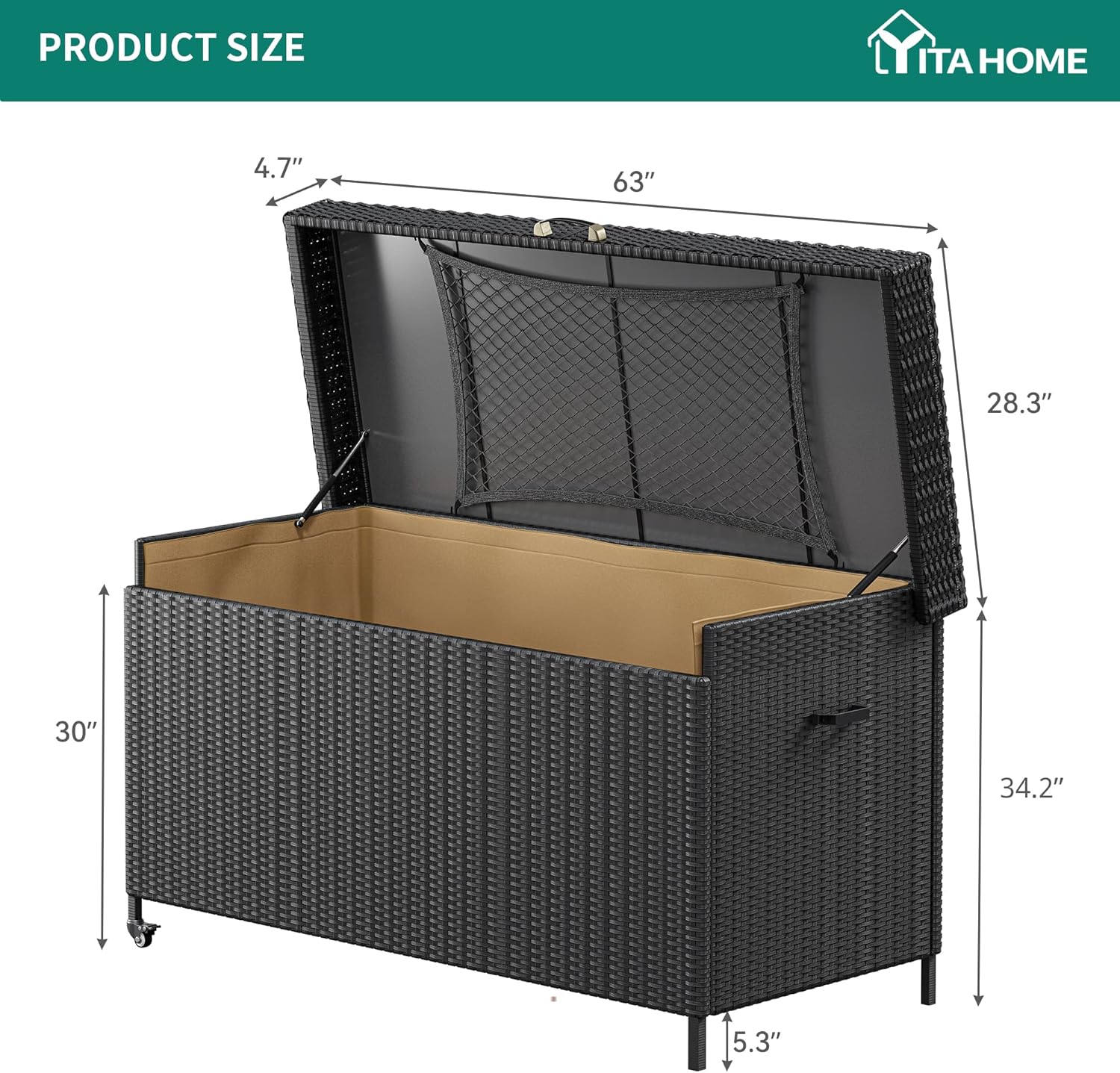 YITAHOME 200 Gallon Large Wicker Deck Box w/Storage Net, Rattan XL Outdoor Storage Box Patio Cushion Storage, Waterproof Storage Box for Patio Furniture, Garden Tools, Pool Sports Equipment (Black)