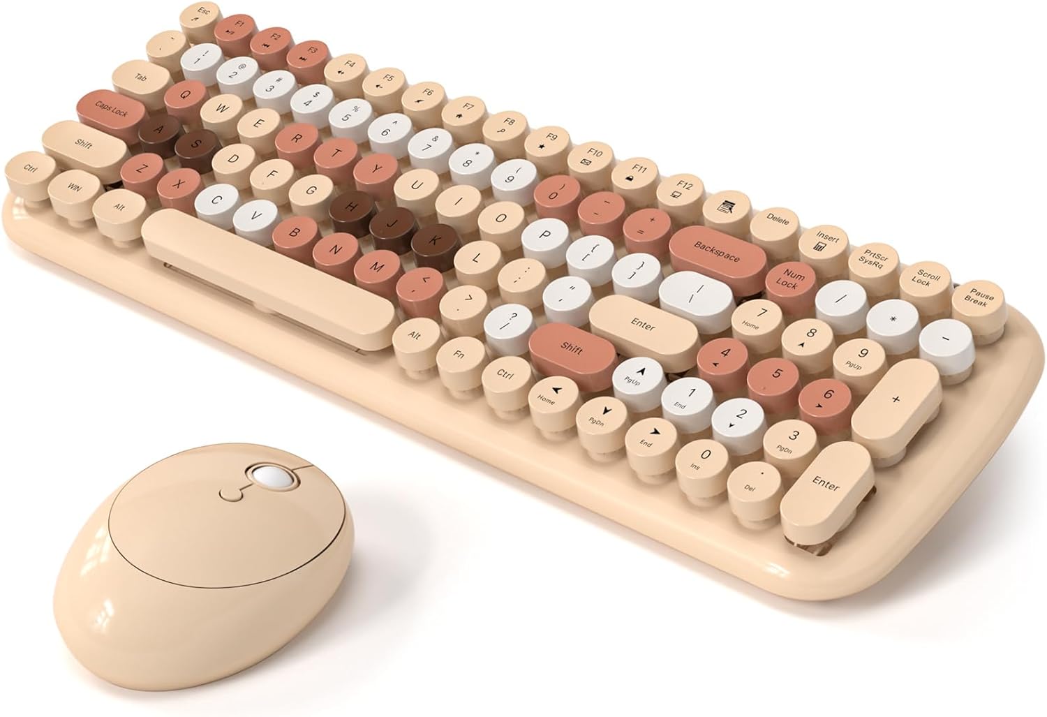Wireless Keyboard and Mouse Combo, MOWUX - Modern Compact Layout, Colorful Compact Candy Mouse and Retro Round Keyboard Set with Cover, for PC/Laptop/Windows/Mac - Milk-Tea Colorful