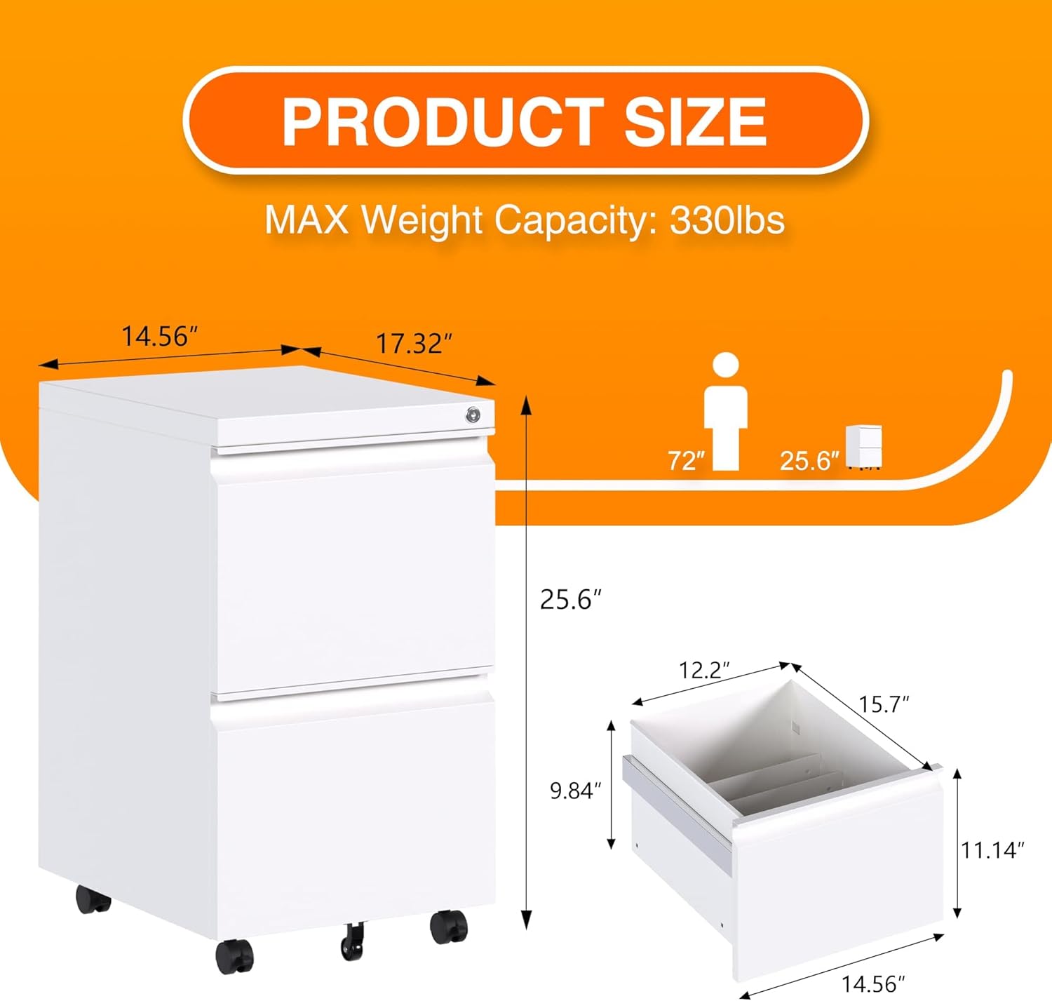 - ăFULLY ASSEMBLED EXCEPT WHEELSăFile cabinet deliver is fully assembled except the casters. Overall Dimension: 14.6" W x 17.3" D x 25.6" H