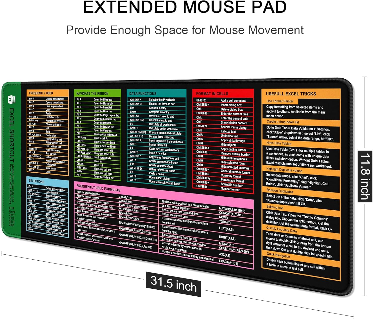 Auhoahsil Large Mouse Pad, XL Gaming Mousepad, Desk Mat for Desktop, Thick Rubber, Big & Long Size, Stitched Edges, Full Desk Pad for Laptop & Computer, Extended 31.5 x 11.8 in, Excel Shortcut