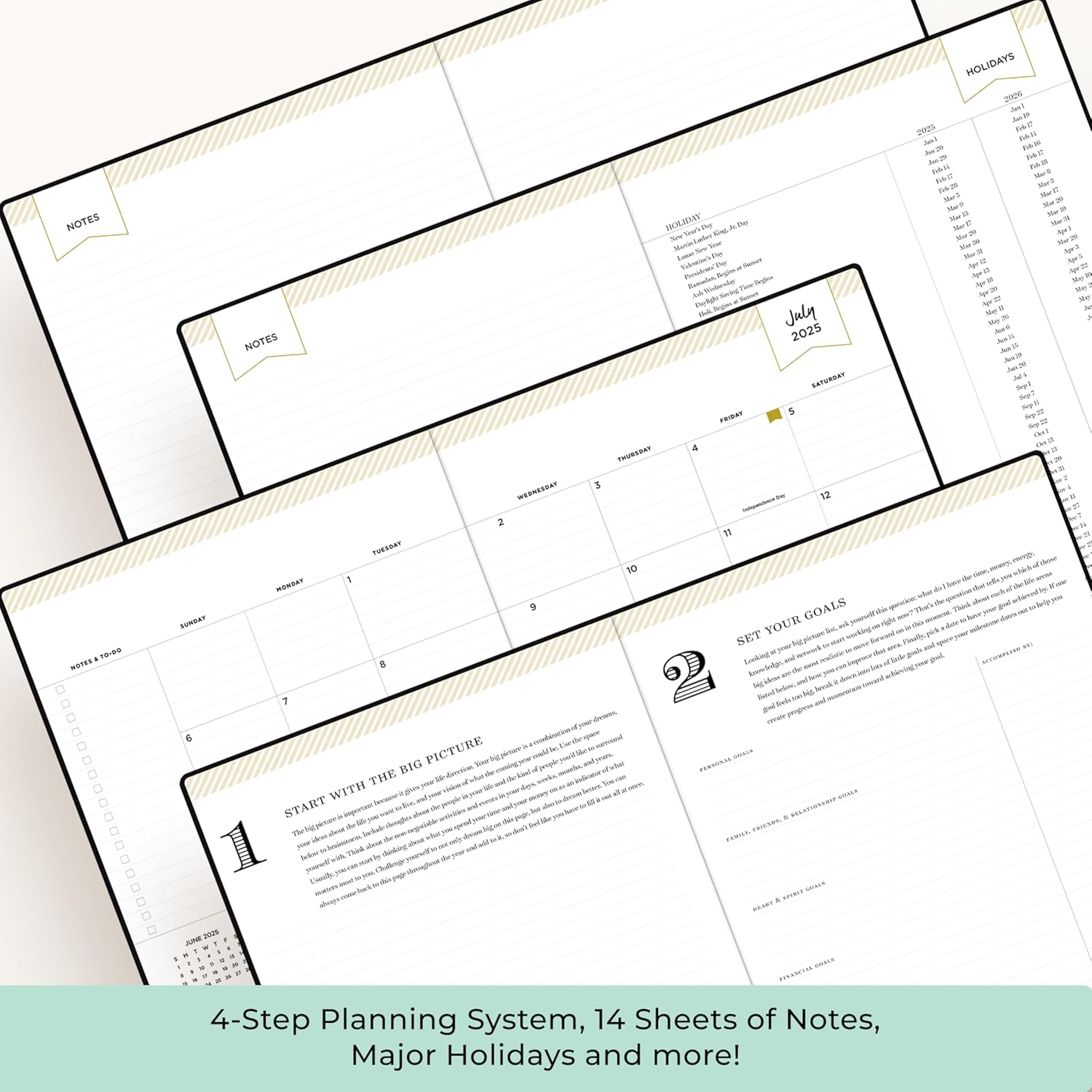 - [MONTHLY LAYOUTS] Monthly layouts contain previous and next month reference calendars for long-term planning, and a notes section for important projects; Major holidays listed, elapsed and remaining days noted