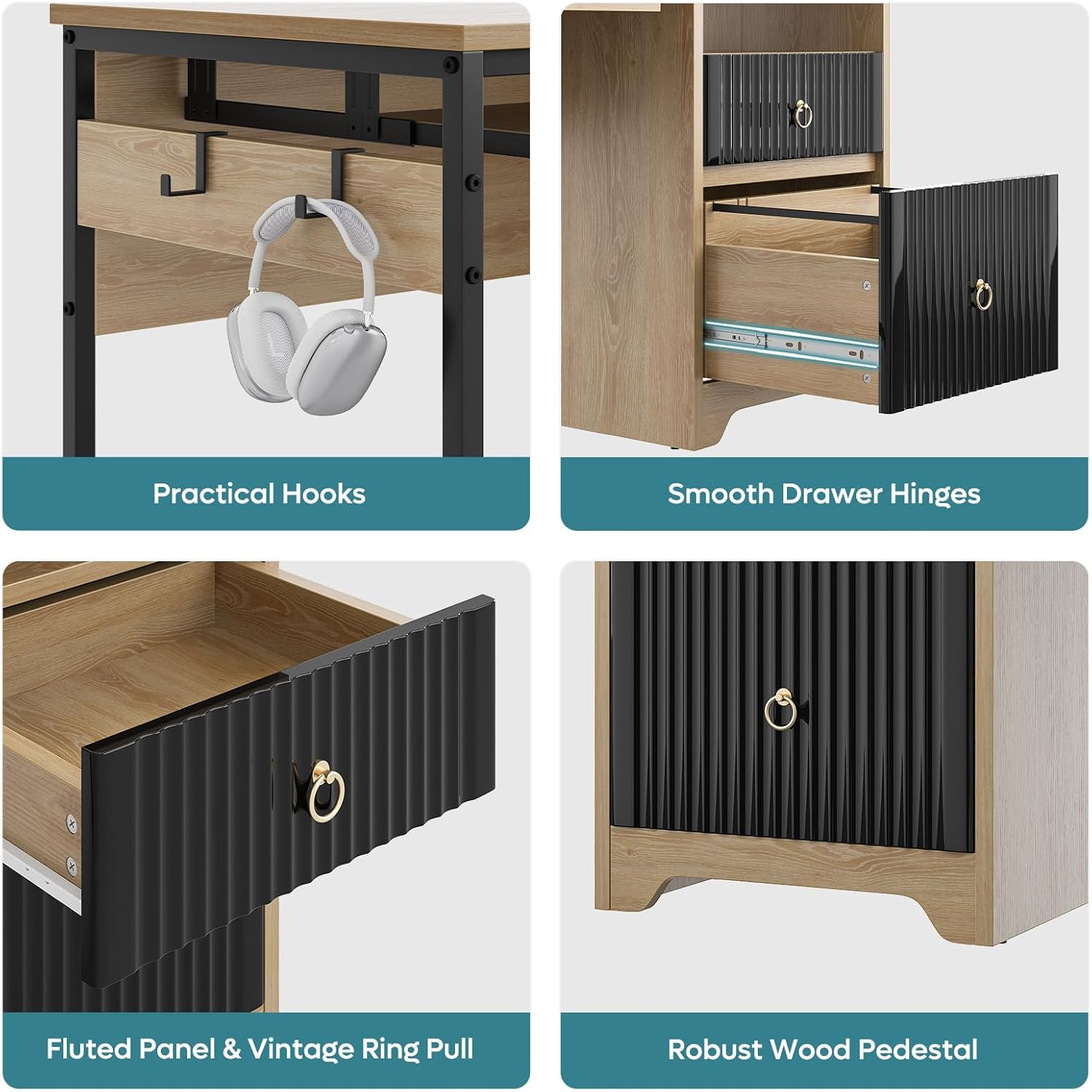 - User-Friendly Design: The home office desk features a flexible keyboard tray for comfortable typing. Its reversible pedestal can be installed on either the left or right side, ensuring seamless integration into any room layout. Additionally, two practical hooks provide convenient storage for headphones or other accessories