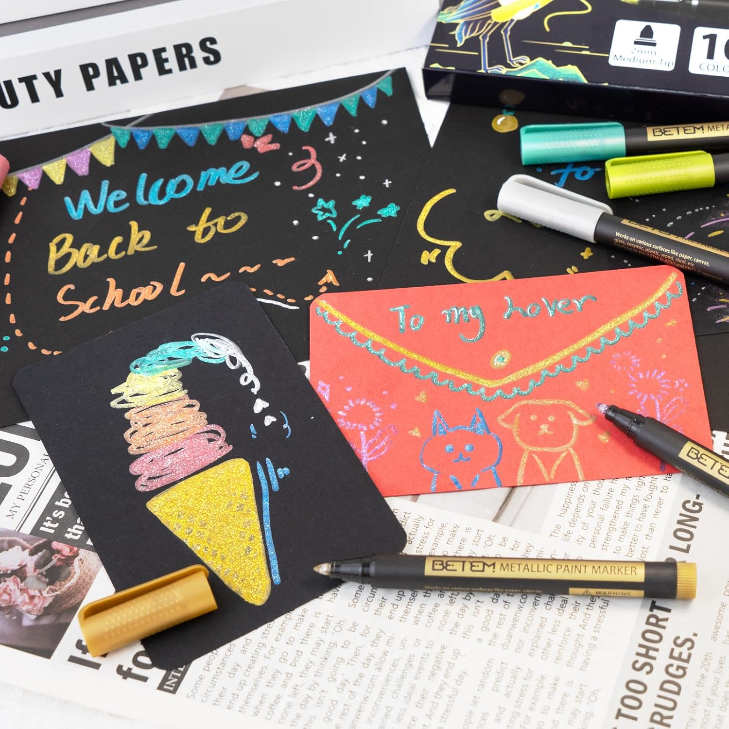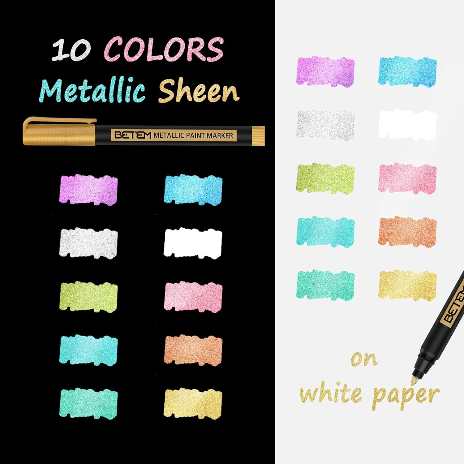 Betem Metallic Paint Markers, 10 Colors Acrylic Paint Markers for Black Paper, 2mm Medium Tips Metallic Glitter Pens for Scrapbooking, Rock Painting, Greeting Cards, Photo Albums, DIY Art Crafts