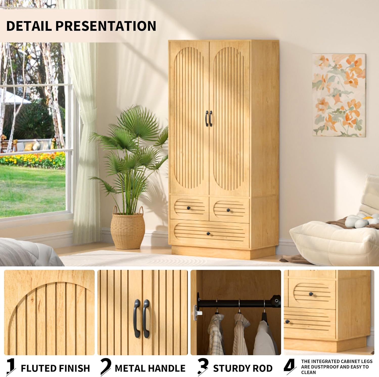 - Elegant Fluted Design: The unique fluted design on the doors of this wardrobe closet with doors adds sophistication and farmhouse charm. The wood grain finish and sophisticated black handles highlight simplicity and rusticity, enhancing visual appeal and complementing various interior styles, making it a versatile addition to your home.