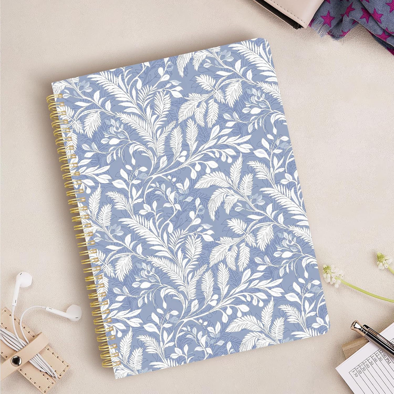 Cute Spiral Notebook journal A4 Aesthetic Pretty Design for Women Girls Kawaii with Pocket, 8.5 x 11 inch, Lined, Blue Leaves