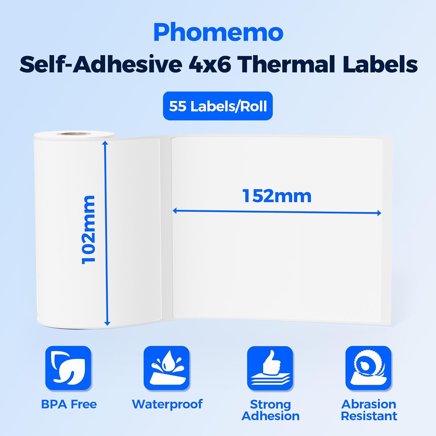 - Phomemo 4 x 6 shipping thermal labels size : 4 x 6 inch, 55 Pcs/ roll