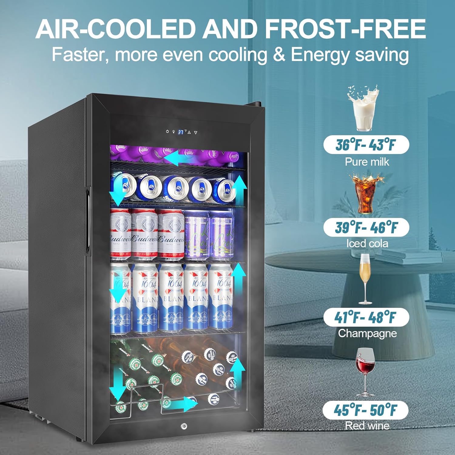 - POWERFUL COMPRESSOR & FAST COOLING TECHNOLOGY: Equipped with an advanced compressor and 360 °air circulation system, this beverage refrigerator ensures rapid and even cooling throughout the entire interior. The constant low temperature keeps your drinks chilled to perfection, ideal for quick refreshment anytime. Perfect for home theaters, kitchens, offices, RVs, dorm rooms, apartments, or gaming rooms, enjoy ice-cold beverages wherever you are.