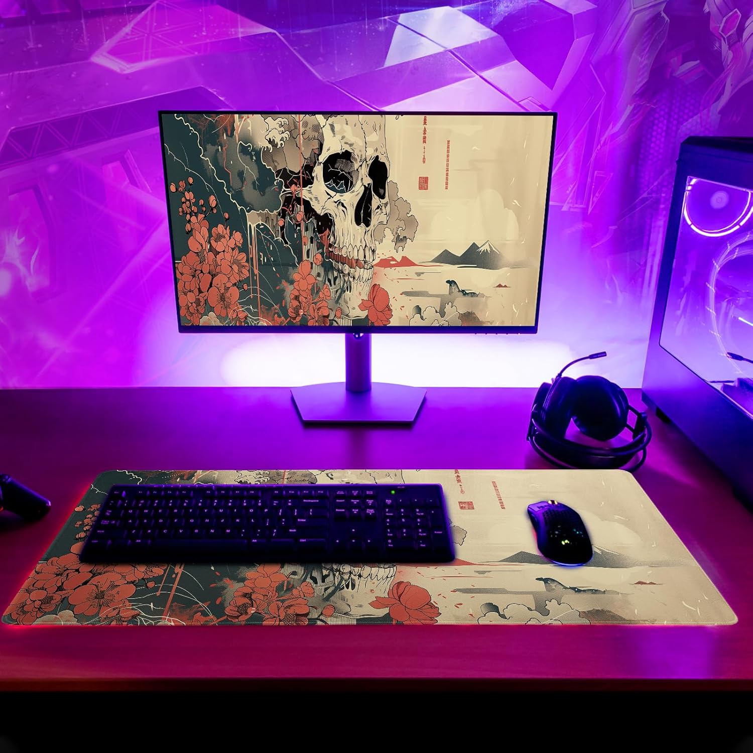 Japanese Ukiyo-e XL Anime Big Mouse Pads Large Skull Gaming Mouse Pad for Men Desk Pad with Stitched Edges Non-Slip Large Computer Mat, 31.5x11.8 in