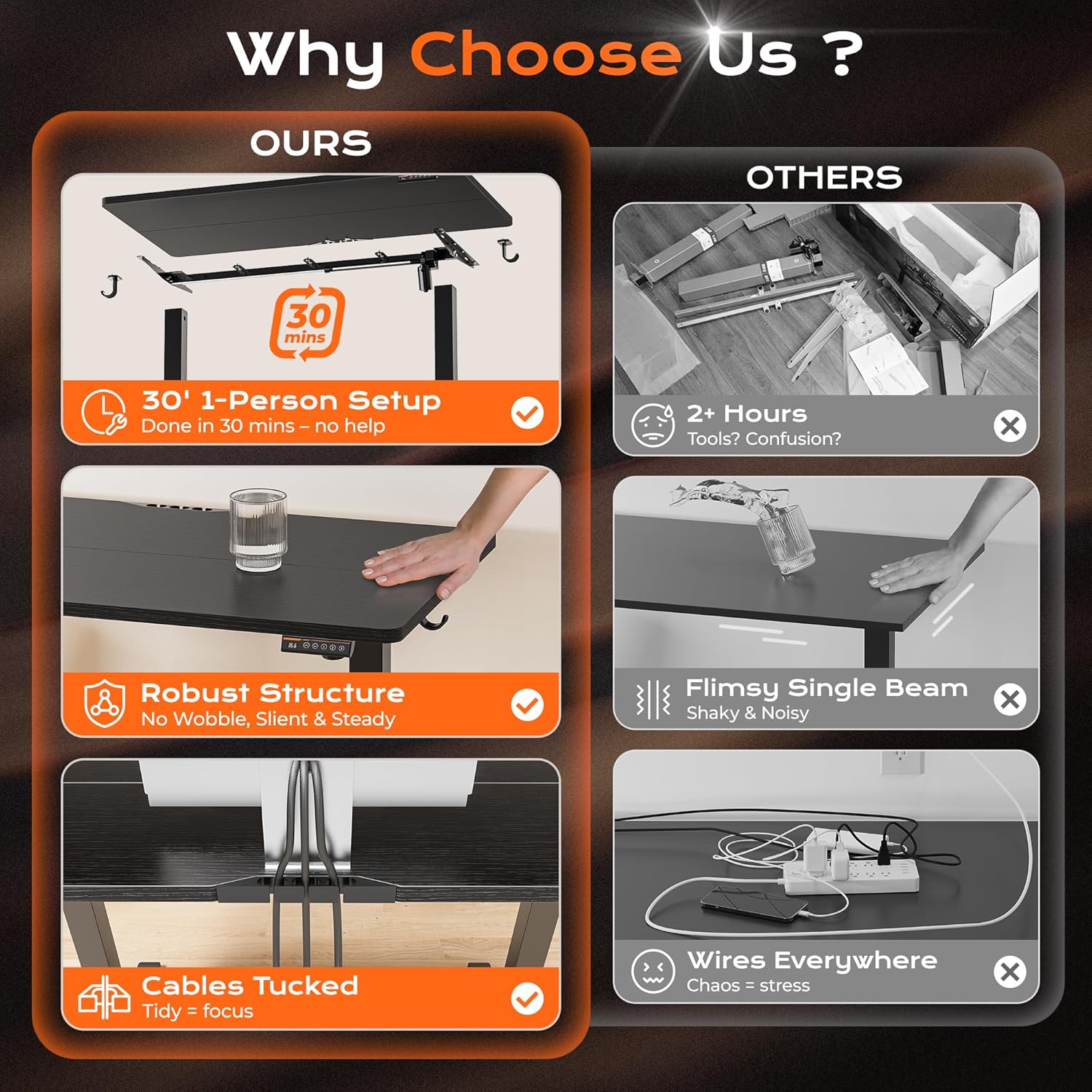 - ăWhisper-Quiet OperationăPowered by a robust yet quiet motor (operating at less than 45 DB), the wide deep desk brings smooth height adjustments without disturbing your household or office environment. This standup desk for home office is ideal for keeping focus and slient