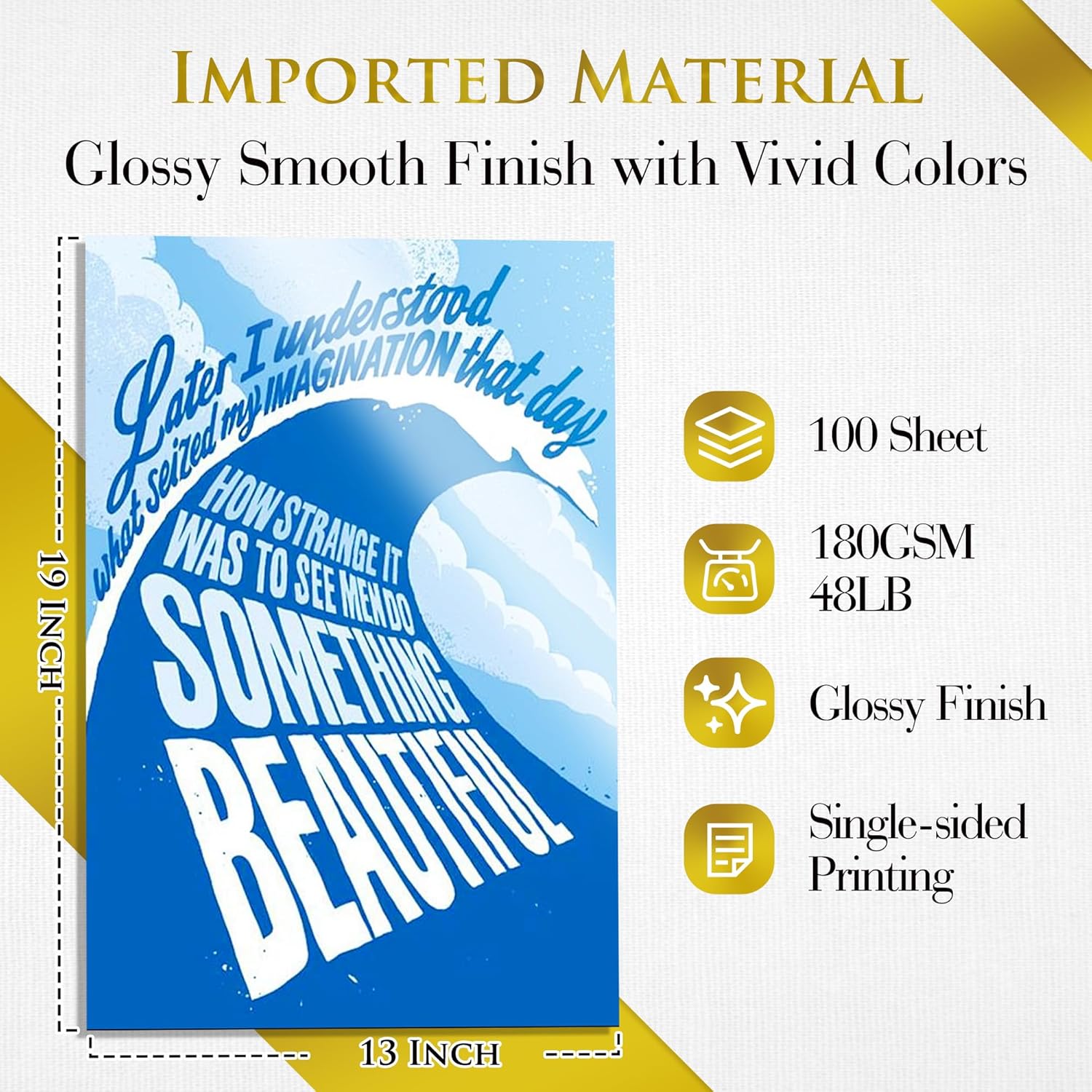 - Photo Paper Package: 100 sheets of glossy photo paper, 13×19 inch, 180gsm/48lb paper, single-sided printing and blank back side for recording or writing.