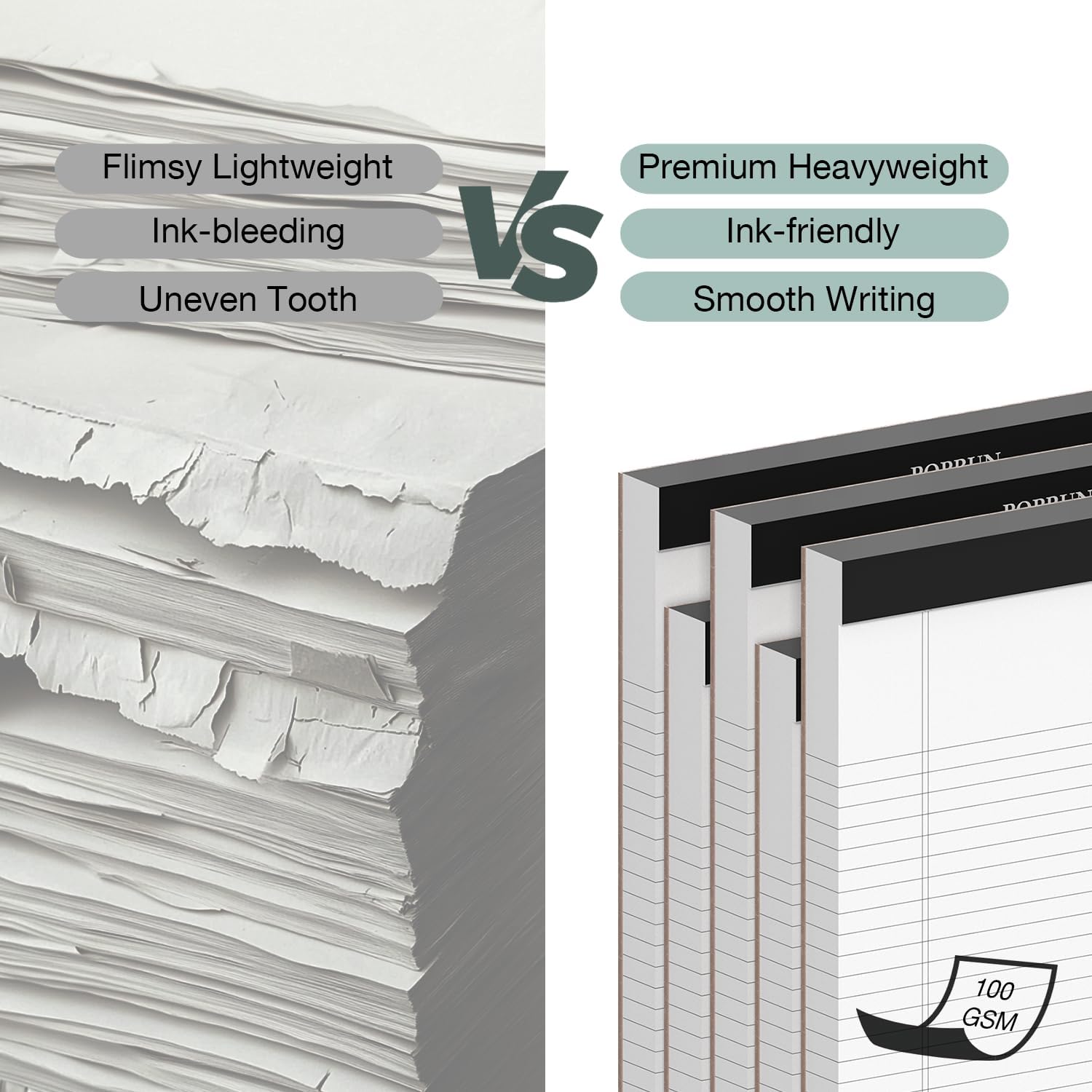 - Premium Quality & Durable Lined Paper: POPRUN Legal Pads contains 50 sheets (per Pack) of 100GSM thick white paper β equivalent to the thickness of 125 sheets of 80GSM paper β paired with a bleed-resistant surface that enables effortless writing with pens or pencils.
